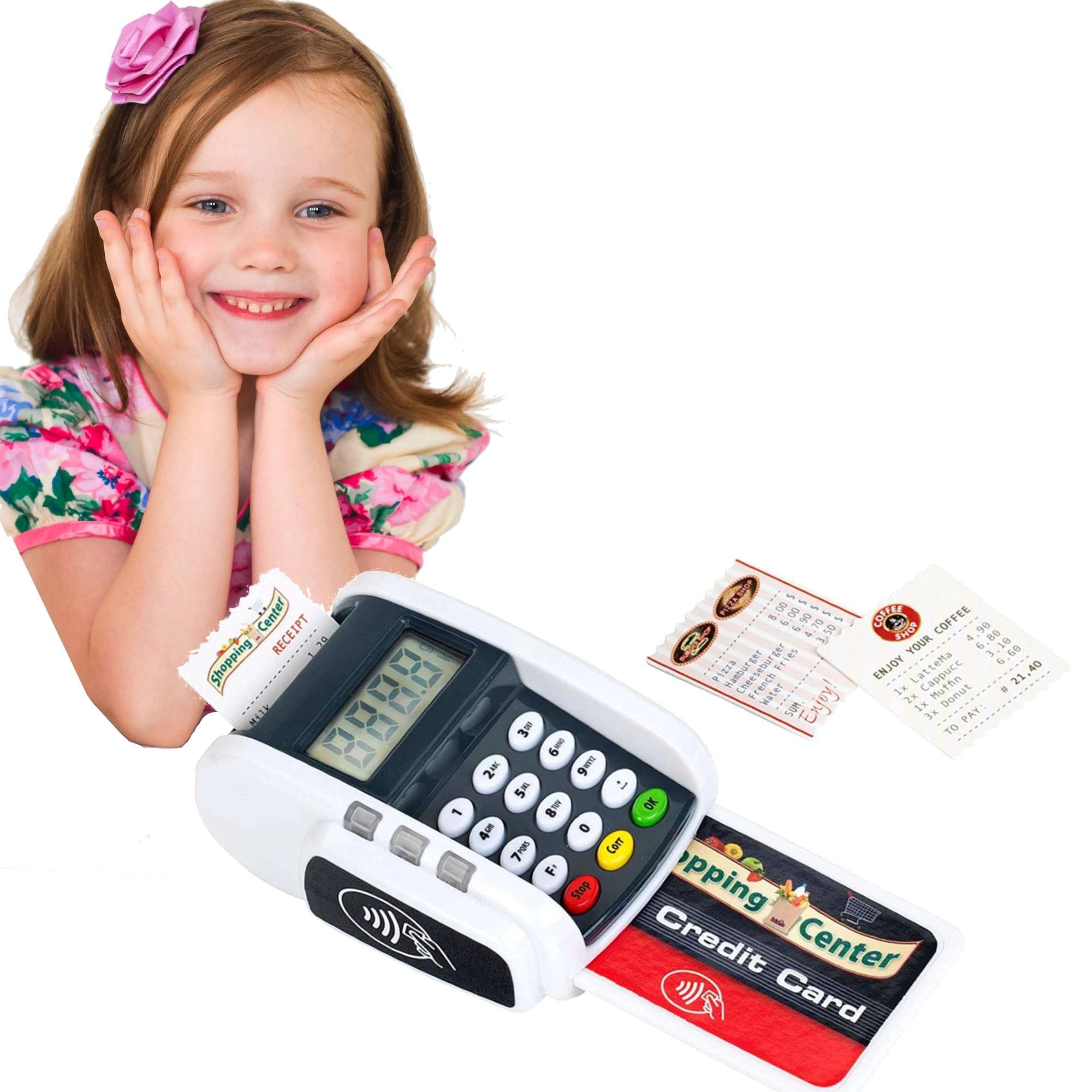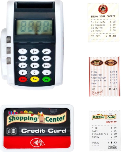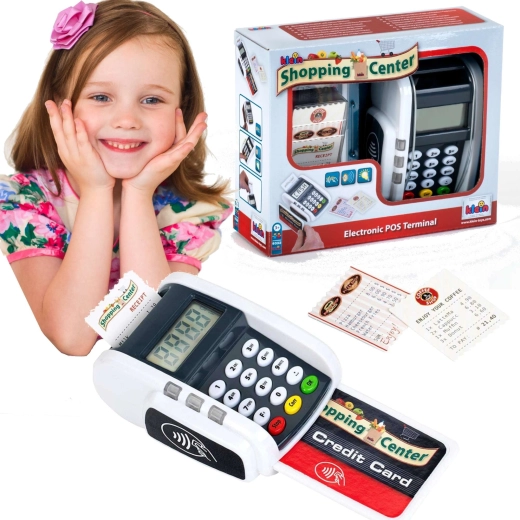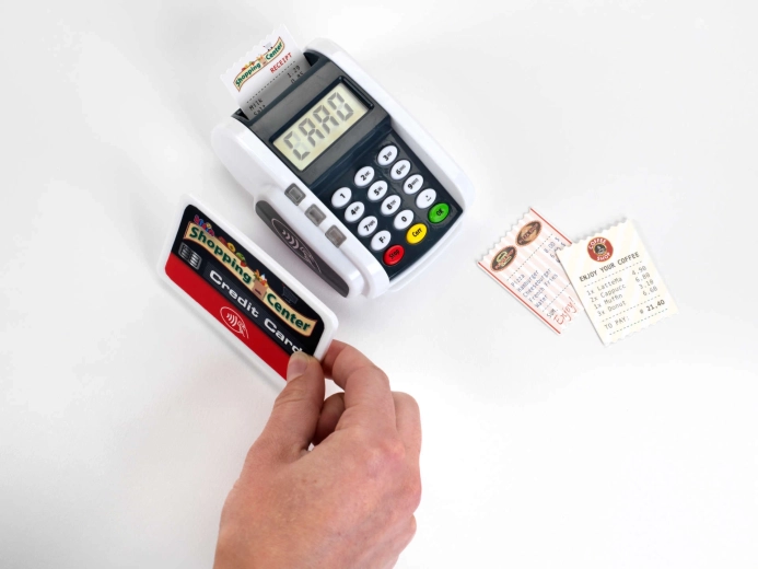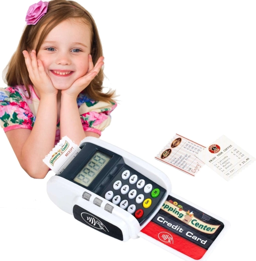 Tento kompaktný terminál verne napodobňuje skutočné zariadenie: deti môžu stláčať číselnú klávesnicu, prikladať platobnú kartu a tlačiť „účtenky“ pre realistickú hru na pokladňu. Svetelné a zvukové efekty dodajú každej transakcii ten správny nádych reality a podporia rozvoj sociálnych zručností.