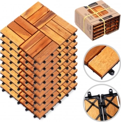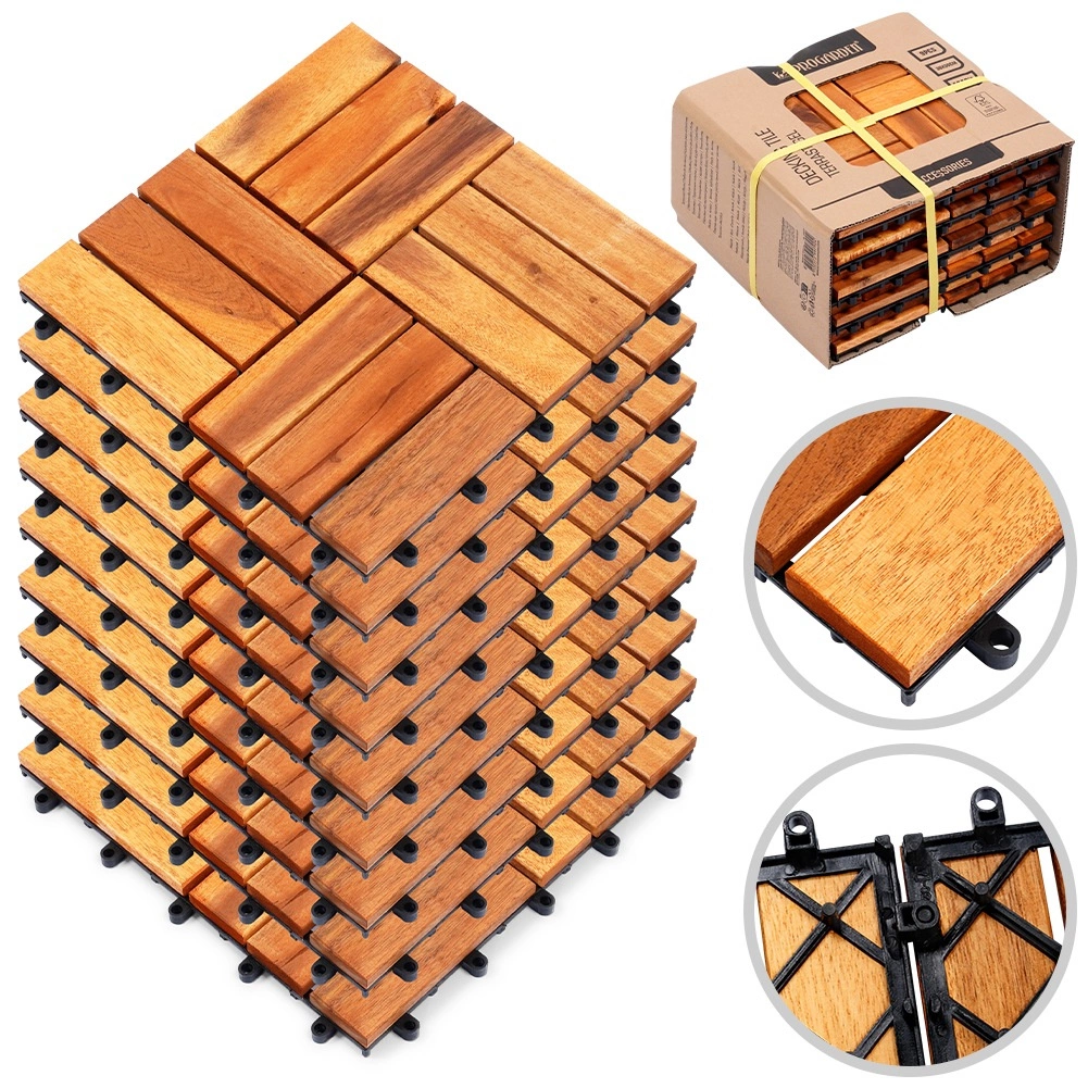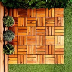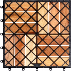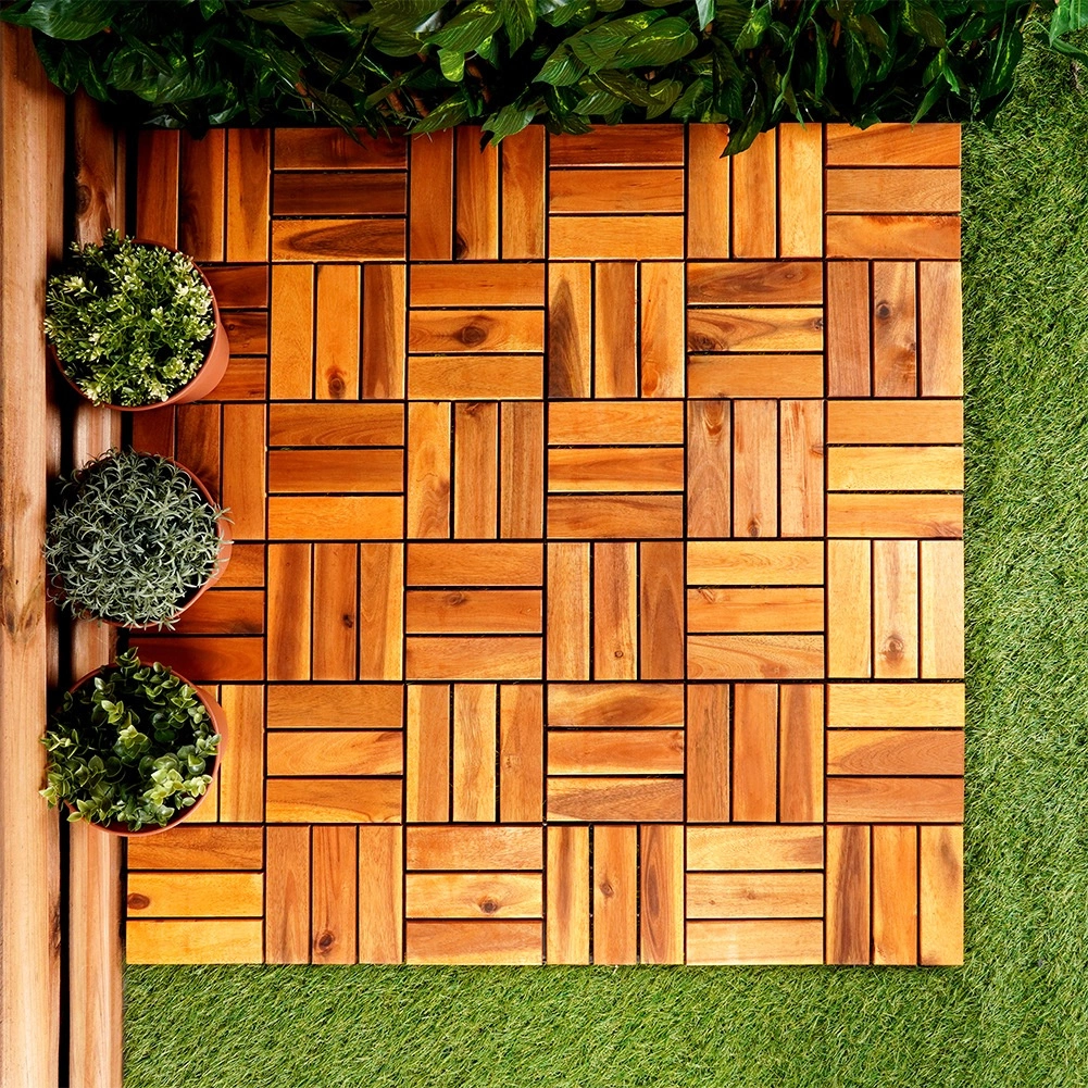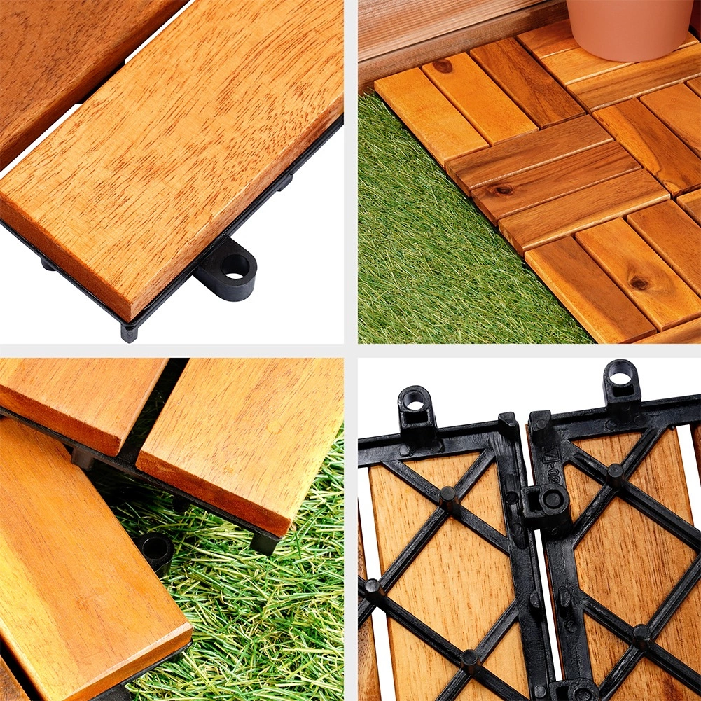 Tieto drevené terasové dlaždice premenia váš balkón, terasu alebo záhradný kút na útulnú a štýlovú zónu. Povrch z kvalitného agátového dreva v teplom hnedom odtieni dodá priestoru prirodzený vzhľad, zatiaľ čo plastová mriežková základňa sa stará o stabilitu, drenáž a odvetrávanie.