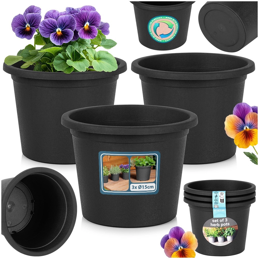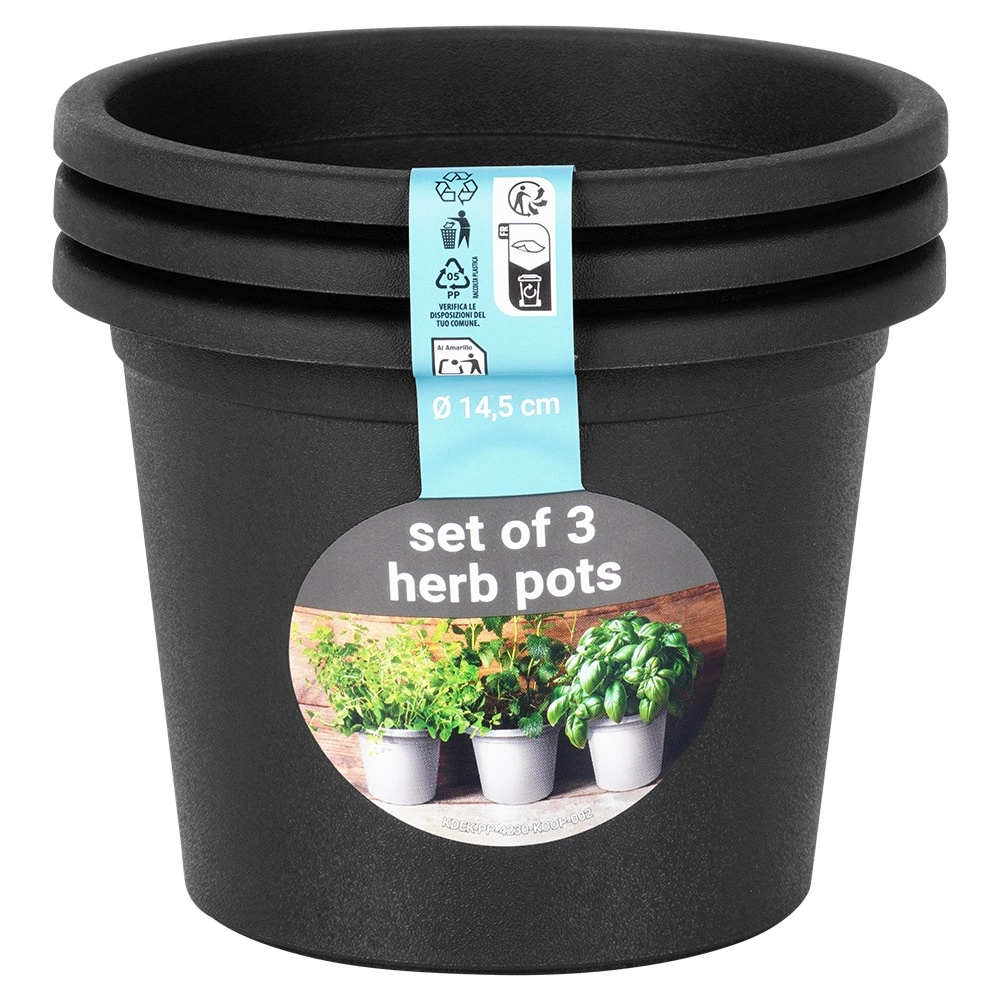 Praktická sada troch čiernych kvetináčov s priemerom 14,5 cm na bylinky a kvety do interiéru aj exteriéru. Ľahké, odolné a z recyklovaného plastu, s elegantným okrúhlym tvarom a celoročnou odolnosťou voči poveternosti na balkón, terasu, záhradu aj do domácnosti.