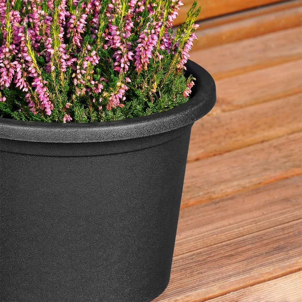 Praktický a štýlový kvetináč na vonkajšie použitie s priemerom 20 cm z odolného plastu. Vďaka okrúhlemu tvaru a čiernej farbe pôsobí elegantne a skvele sa hodí na balkón, terasu aj do záhrady. Vyrobený z materiálu z 90 % z recyklácie a je 100 % recyklovateľný. Odolá dažďu, vetru aj UV žiareniu a je nenáročný na údržbu.