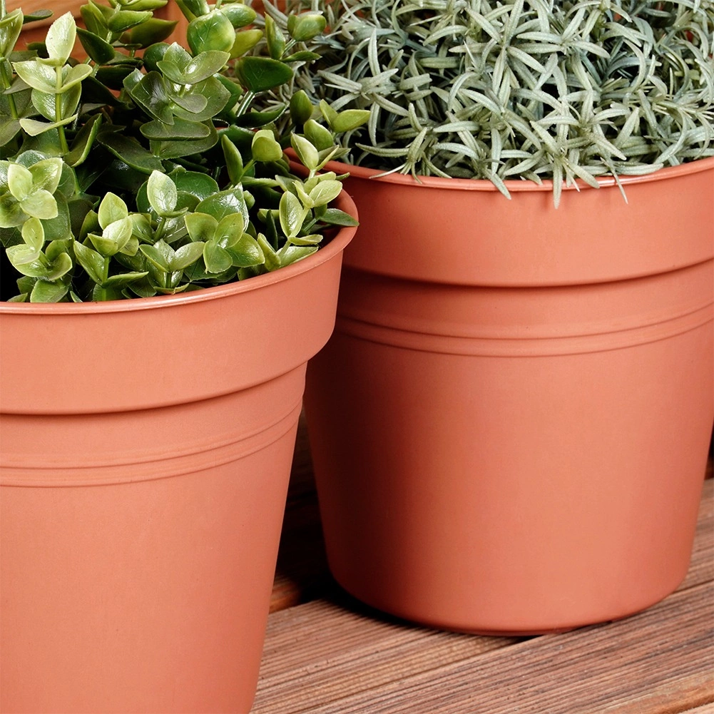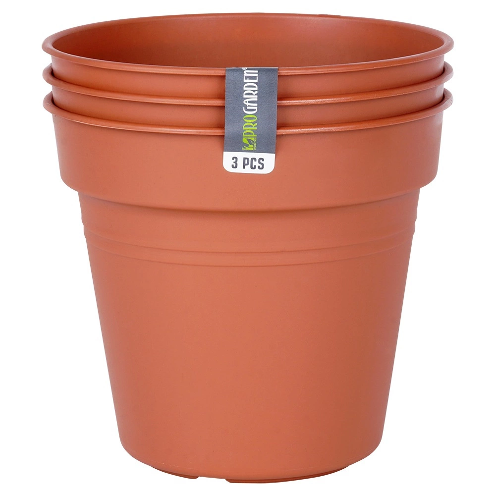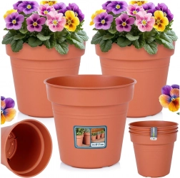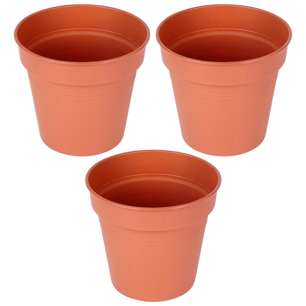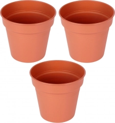 Praktická sada 3 plastových kvetináčov s priemerom 17 cm v tehlovej farbe na bylinky aj kvety. Kvetináče majú klasický okrúhly tvar, sú ľahké, odolné voči poveternosti a hodia sa na balkón, terasu, záhradu aj do interiéru. Vyrobené z odolného recyklovaného materiálu (70 %) pre jednoduchú údržbu a dlhú životnosť.