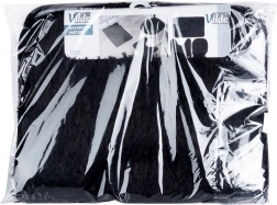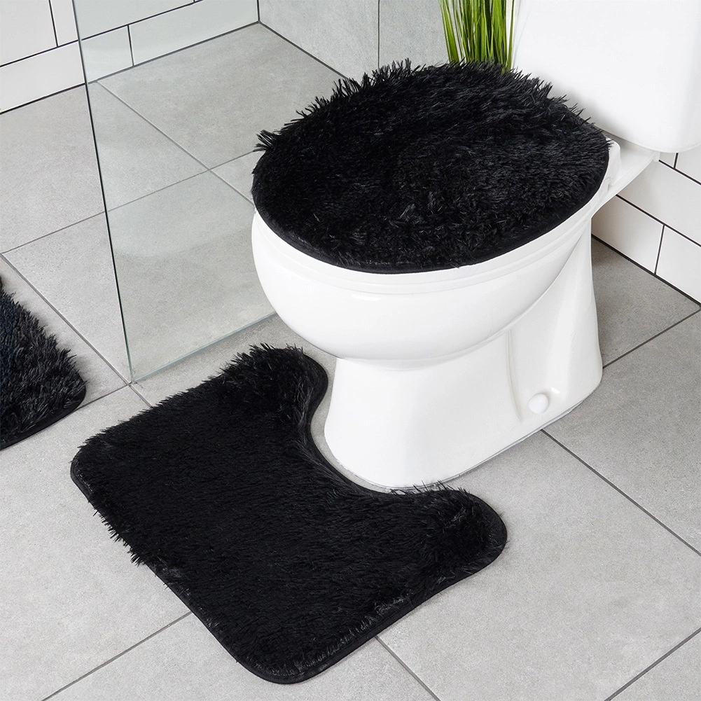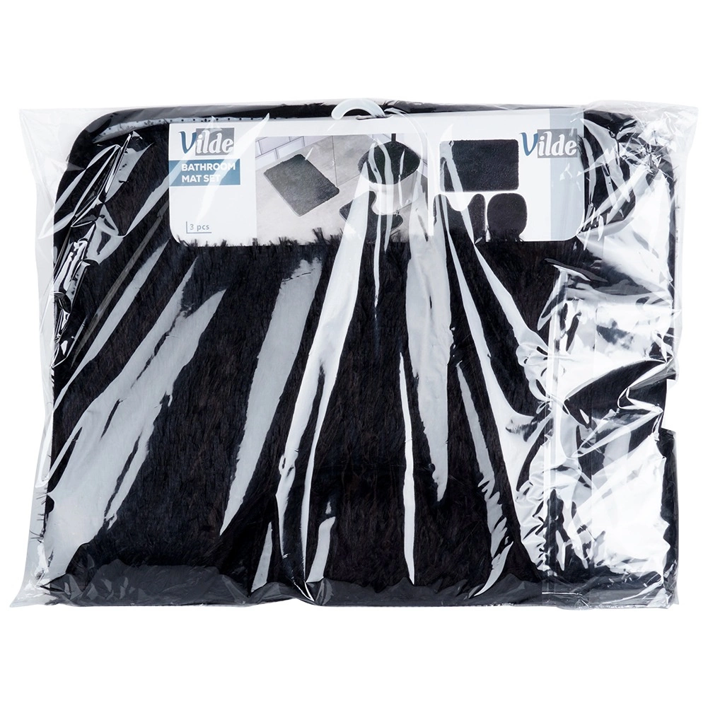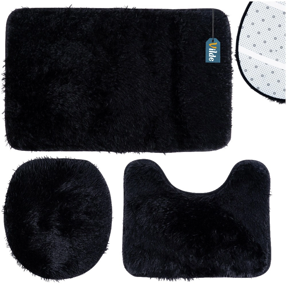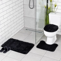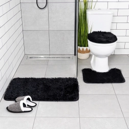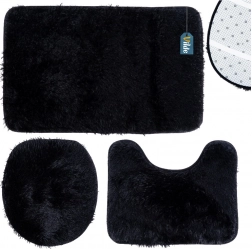 Sada zahŕňa obdĺžnikovú predložku k vani či sprche, U‑výrez k základni WC pre čistý a komfortný priestor okolo toalety a poťah na veko toalety s gumičkami pre pevné uchytenie. Minimalistická čierna farba sa hodí do každého interiéru a zvýrazní dizajn kúpeľne.