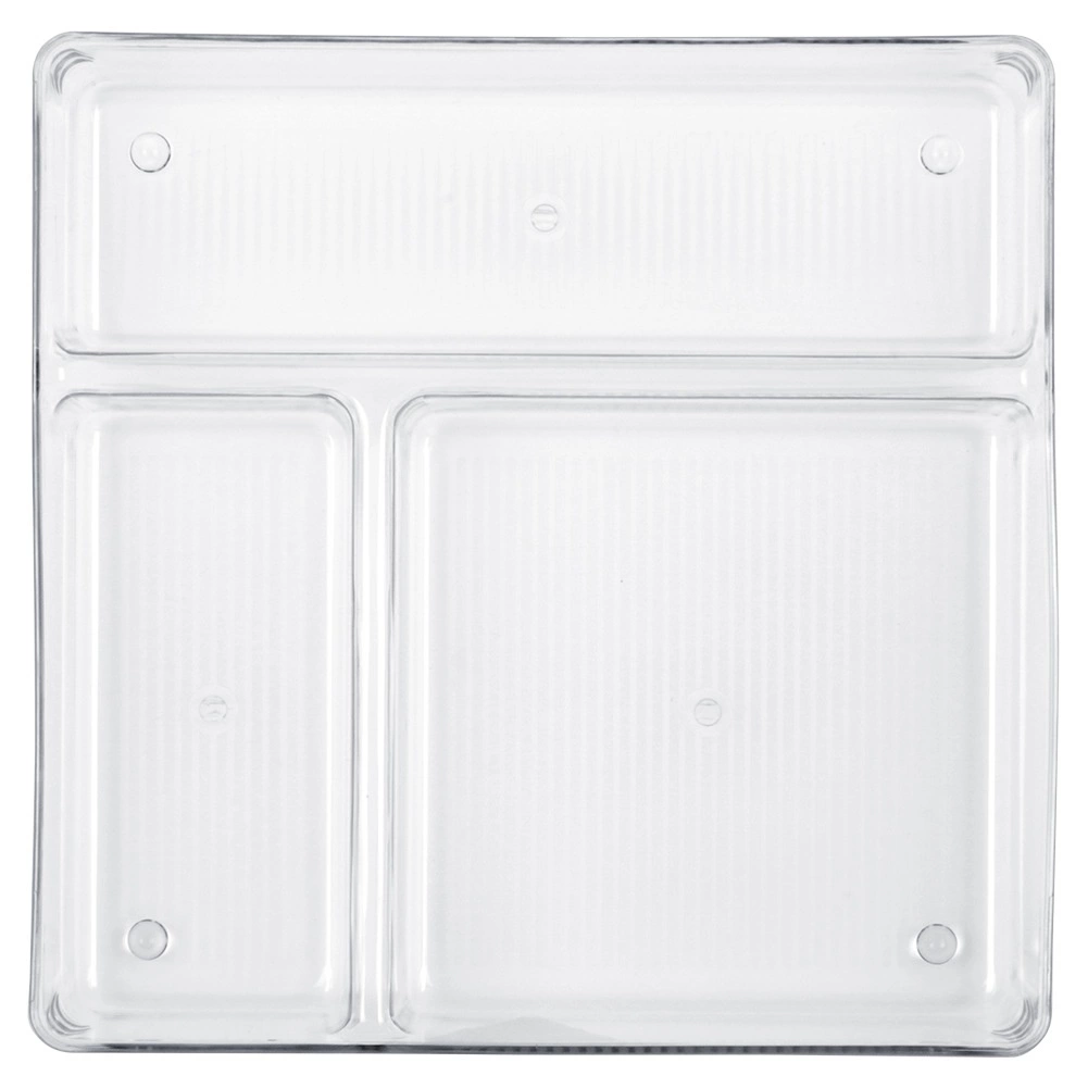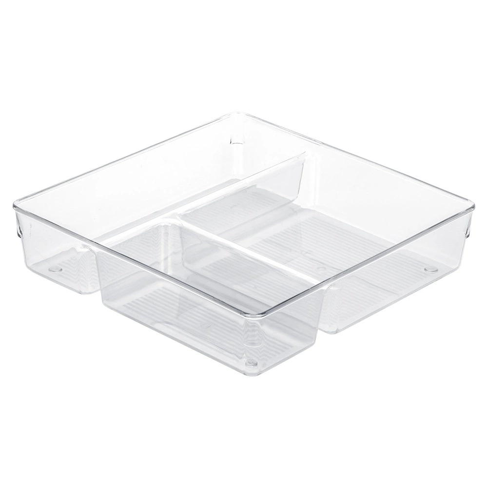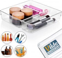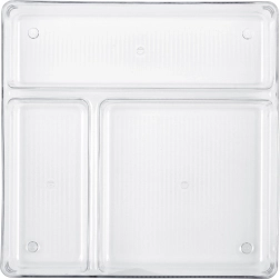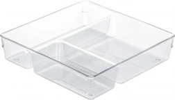 Praktický priehľadný organizér do zásuvky s rozmermi 23 × 23 × 5,5 cm pomôže udržať poriadok v kuchyni, kúpeľni, kancelárii aj šatníku. Má tri rôzne veľké priehradky pre jednoduchú segregáciu drobností, je pevný a odolný a vďaka transparentnému prevedeniu máte všetko hneď na očiach. Ľahko sa čistí a odoláva teplotám od -40 °C do +50 °C.