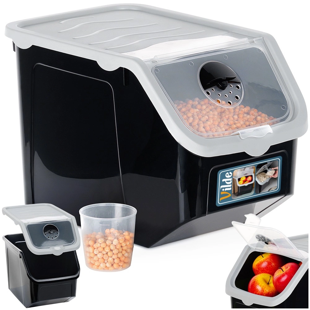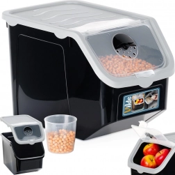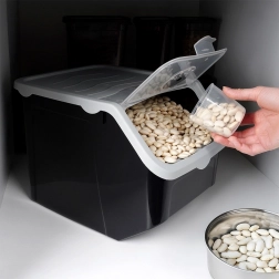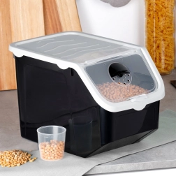 Box je z kvalitného plastu v čiernej farbe so sivým vekom, je vhodný na kontakt s potravinami, znáša teploty od -20 °C do 100 °C, môžete ho dať do mrazničky aj umývačky riadu. Skvele poslúži aj na strukoviny, ryžu, cestoviny, krmivo pre domácich miláčikov či pracie prostriedky. Súčasťou je praktická odmerka na presné dávkovanie.