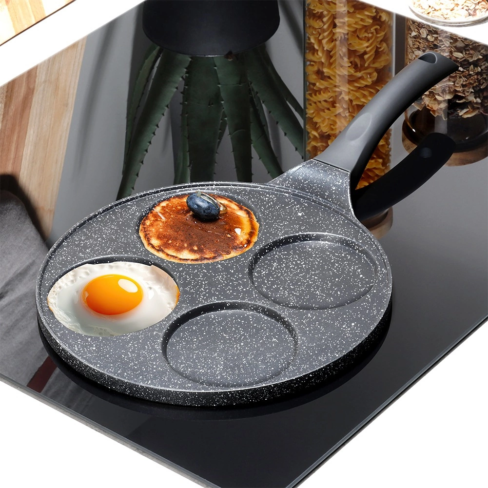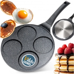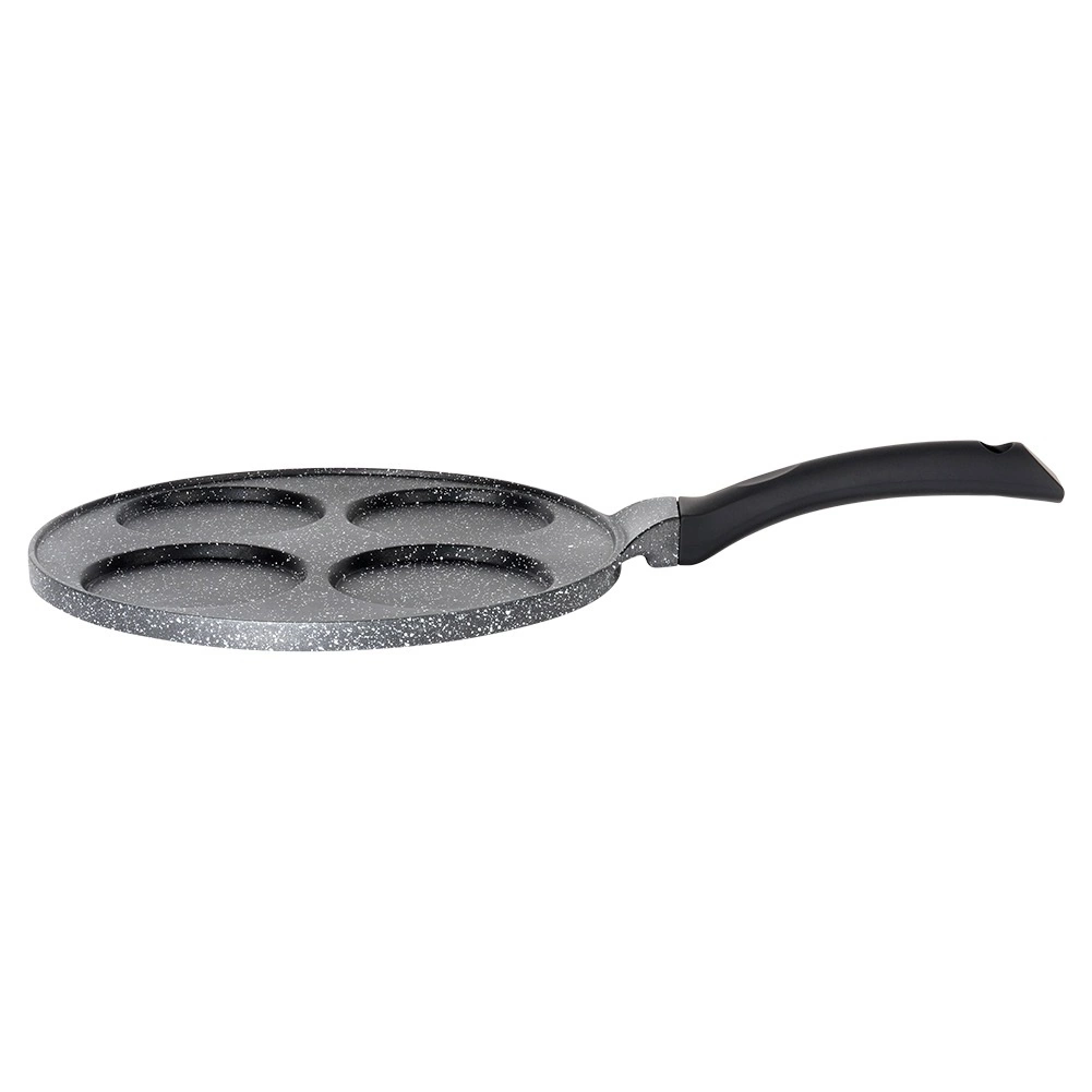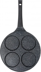 Praktická granitová panvica na vajcia a lievance so štyrmi formami s priemerom 9 cm zaistí dokonalý guľatý tvar, nepriľnavé vyprážanie s minimom tuku a rovnomernú distribúciu tepla. Ergonomická rukoväť soft touch sa nezahrieva a je pohodlná a bezpečná do ruky. Vhodná na všetky typy sporákov vrátane indukcie a do umývačky.