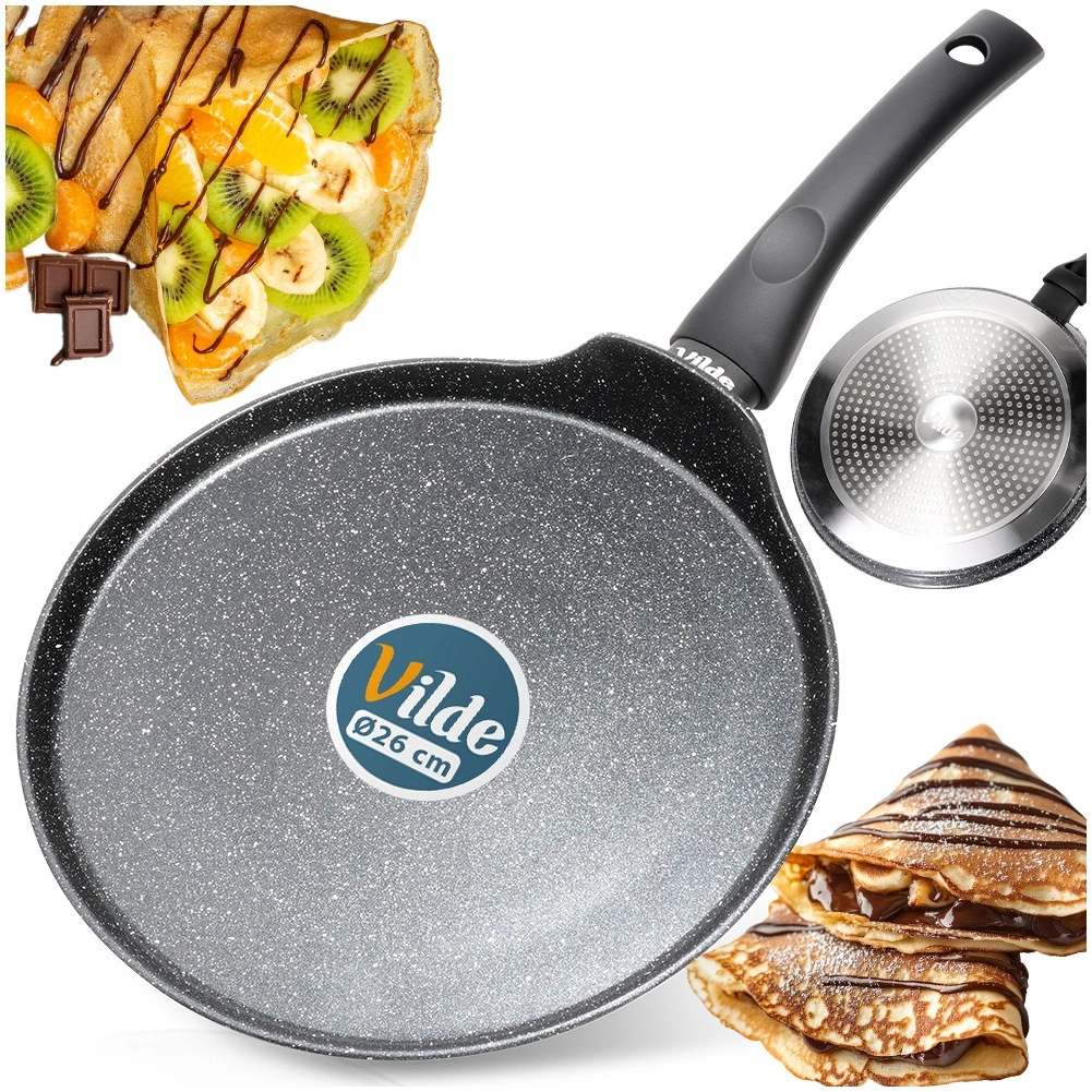Pripravte dokonale tenké palacinky, lievance aj omelety vďaka širokej, plochej ploche a nízkemu okraju, ktoré uľahčujú nalievanie cesta, nadvihovanie a obracanie. Granitová nepriľnavá vrstva v čiernej farbe umožňuje variť s minimom tuku a zaistí ľahké uvoľnenie pokrmu z panvice.