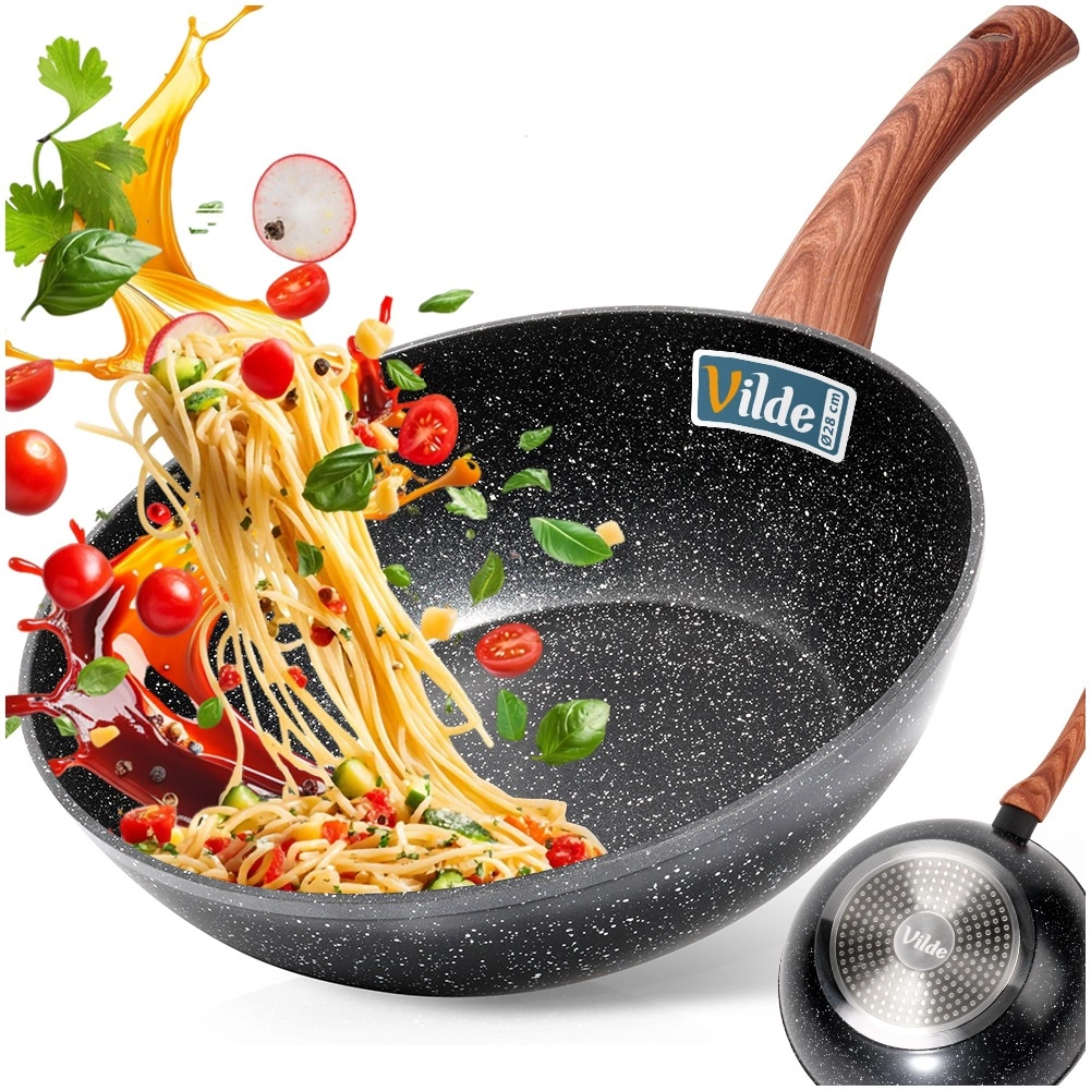 Objavte praktický granitový wok v elegantnej kombinácii čiernej a dreva z kolekcie VILDE Black&Wood. Hlboké, zaoblené telo umožňuje pohodlné restovanie, miešanie aj hádzanie surovín nad plameňom, zatiaľ čo nepriľnavý granitový povrch zaistí ľahké uvoľnenie pokrmov a rýchle upratovanie.