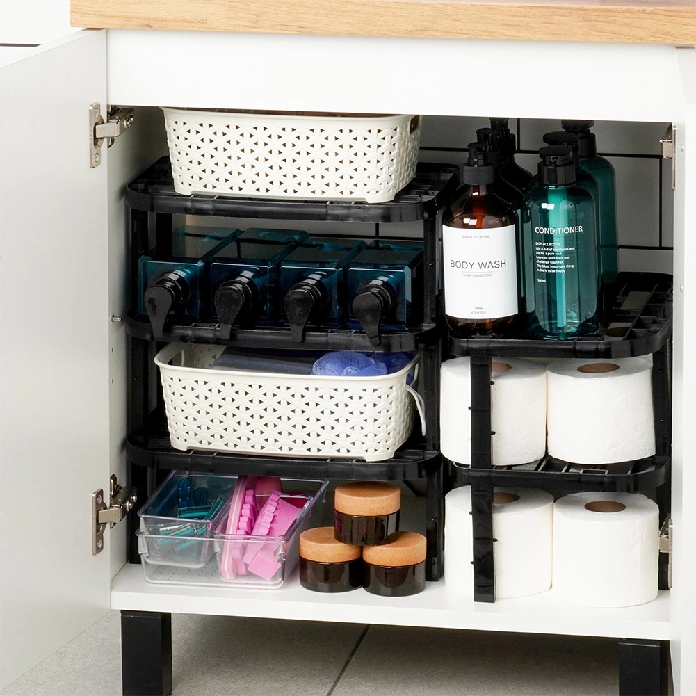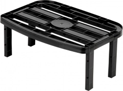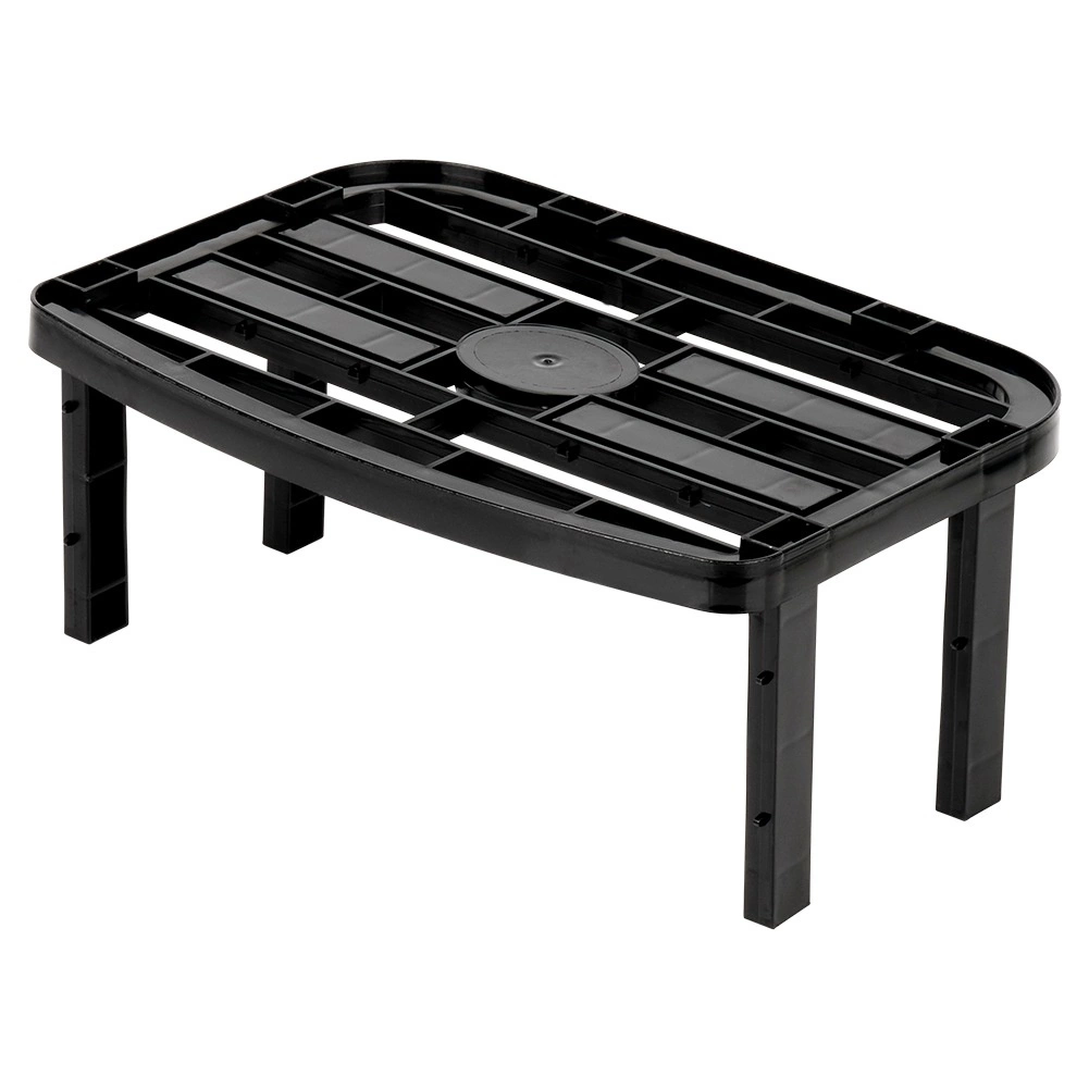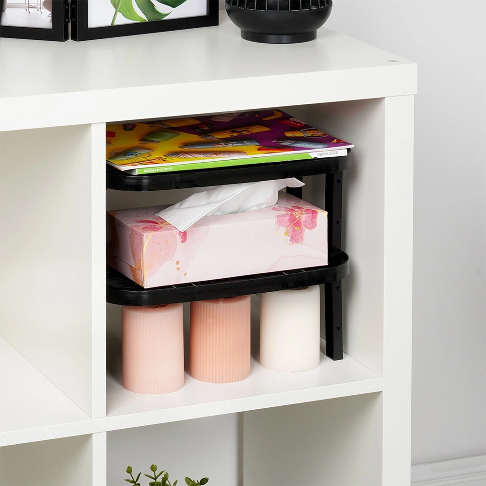 Robustná plastová konštrukcia v čiernej farbe je stabilná, ľahko sa udržiava a vďaka dvom sadám nožičiek (13 cm a 10,5 cm) si zvolíte výslednú výšku 14,5 cm alebo 11,5 cm. Polica je vhodná do kuchyne, špajze, kúpeľne aj kancelárie a možno ju stohovať na vytvorenie viacerých úrovní úložného priestoru.