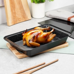 Tento odolný pekáč z uhlíkovej ocele s granitovou povrchovou úpravou zabezpečuje rovnomerné prepečenie pokrmov a minimalizuje riziko pripaľovania. Nepriľnavý povrch umožňuje piecť s minimom tuku a výrazne uľahčuje údržbu – stačí utrieť vlhkou handričkou alebo umyť ručne.