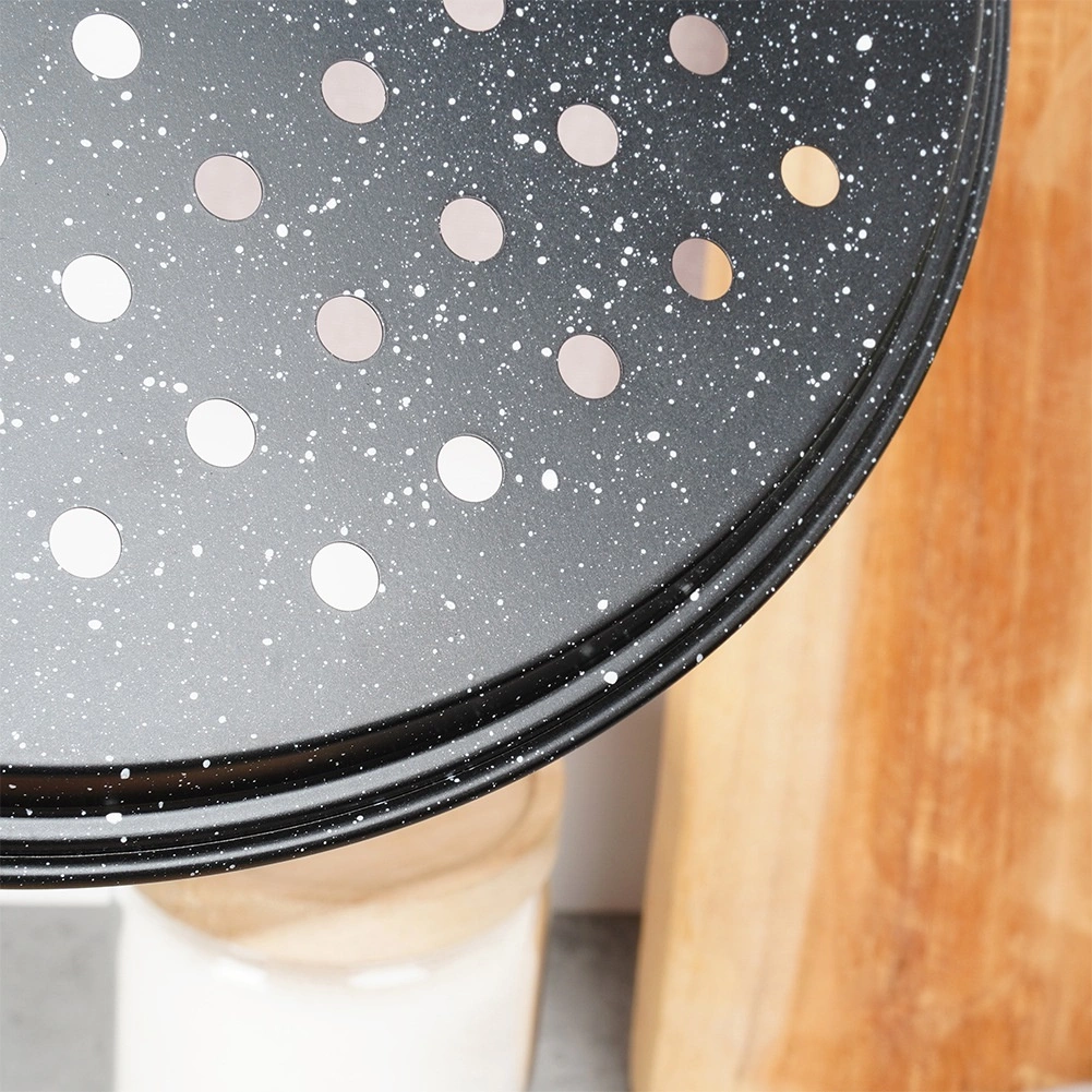 Pečte domácu pizzu s dokonale chrumkavým spodkom. Perforované dno zabezpečuje lepšiu cirkuláciu vzduchu a rýchlejší odvod pary, takže sa cesto prepečie rovnomerne a zostane krásne chrumkavé. Nepriľnavá granitová vrstva minimalizuje pripaľovanie aj pri malej dávke tuku a uľahčuje čistenie.