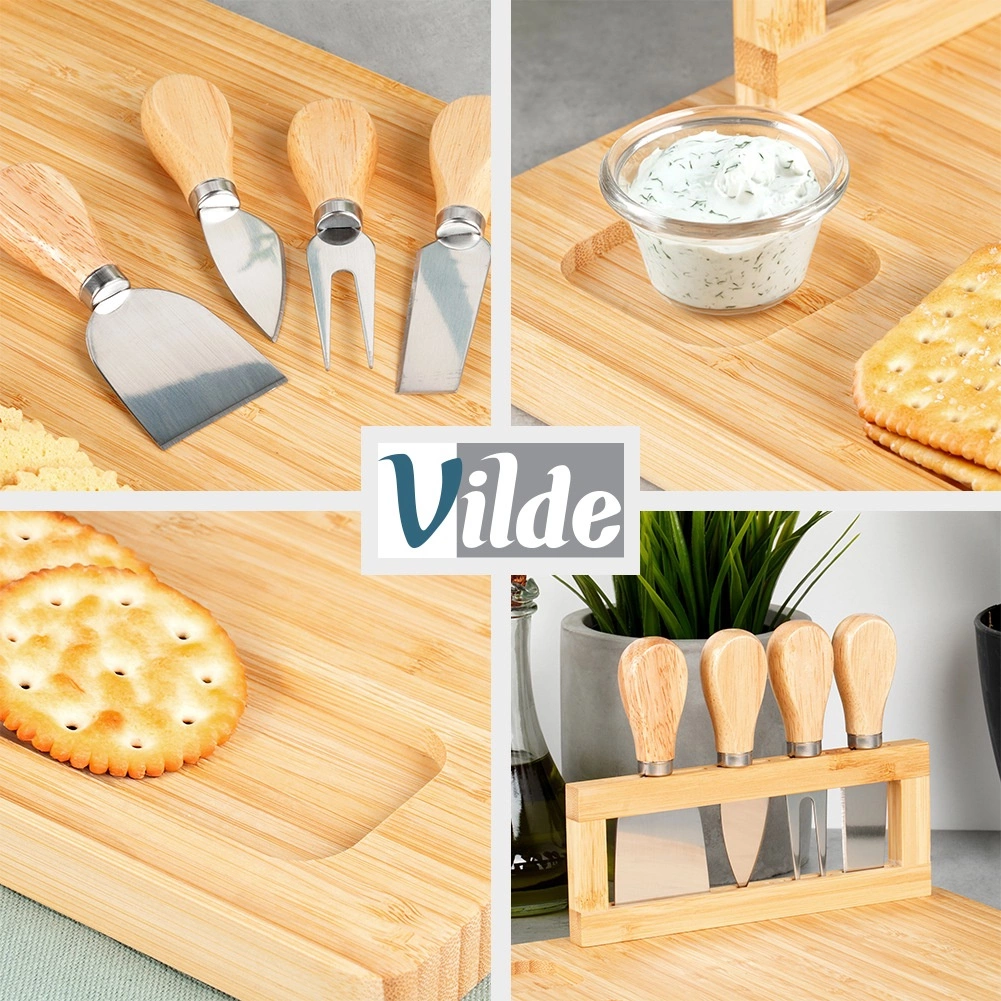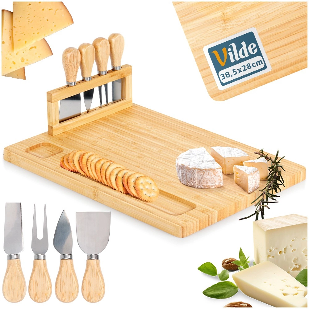 Štýlová sada pre milovníkov syrov: bambusová doska s integrovaným stojanom a štyrmi nástrojmi z nehrdzavejúcej ocele. Ideálna na krájanie, porciovanie a servírovanie syrov, údenín aj snackov. Prírodný bambus je odolný proti vlhkosti, rýchlo schne a nepohlcuje pachy. Skvelé na domáce použitie, párty aj večery s vínom.
