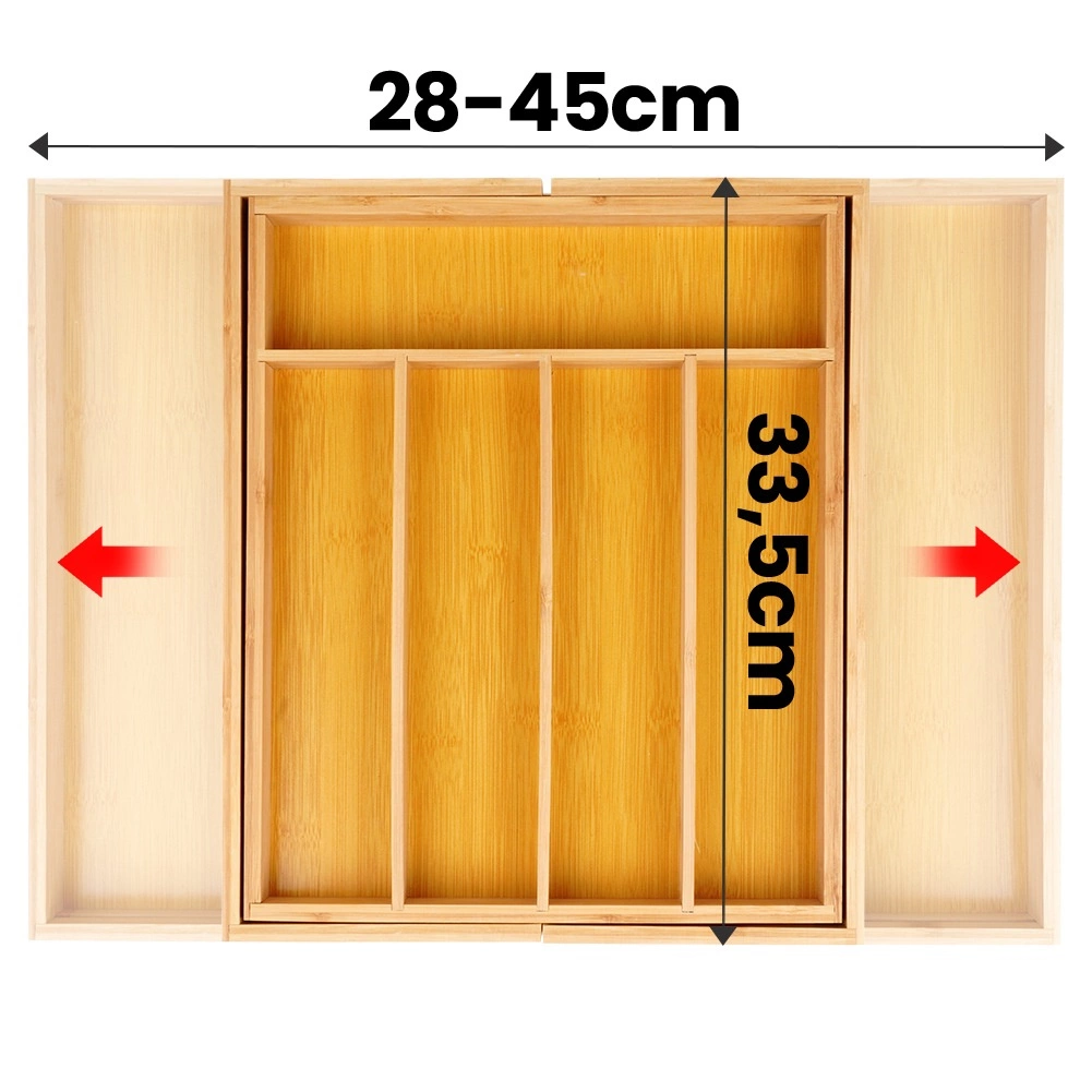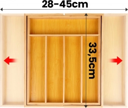 Usporiadajte svoju kuchyňu rýchlo a efektívne. Bambusový vložený organizér do zásuvky s možnosťou rozšírenia z 35,5 na 54,5 cm sa prispôsobí väčšine štandardných zásuviek a ponúkne dostatok priestoru pre príbory, nože aj kuchynské náradie. V zatvorenom stave má rozmery 45,5 × 35,5 × 5 cm, po roztiahnutí 54,5 × 45,5 × 5 cm.