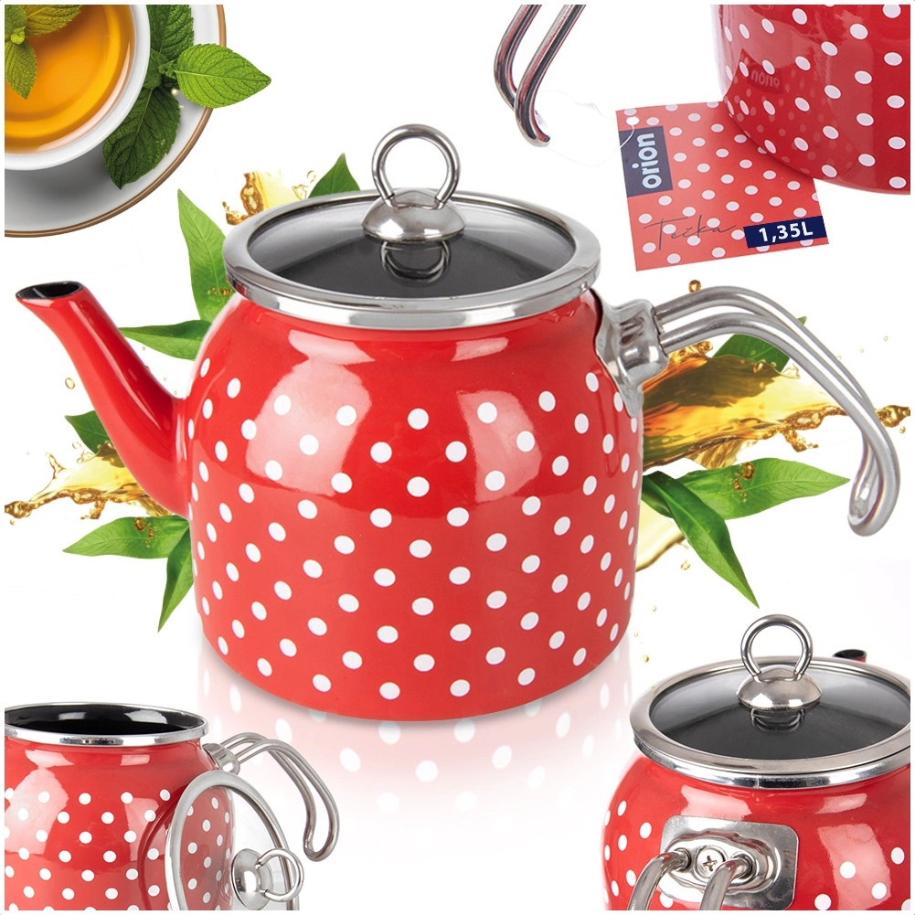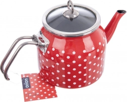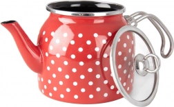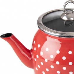 Smaltovaná kanvica BODKA spája retro vzhľad s modernou funkčnosťou. Červený smalt s bielymi bodkami dopĺňa nerezový lem a madlo, vnútrajšok je v elegantnej čiernej farbe. Sklenená pokrievka umožní pohodlne sledovať var a vďaka úchytu sa ľahko odklápa pri dopĺňaní vody.