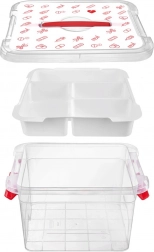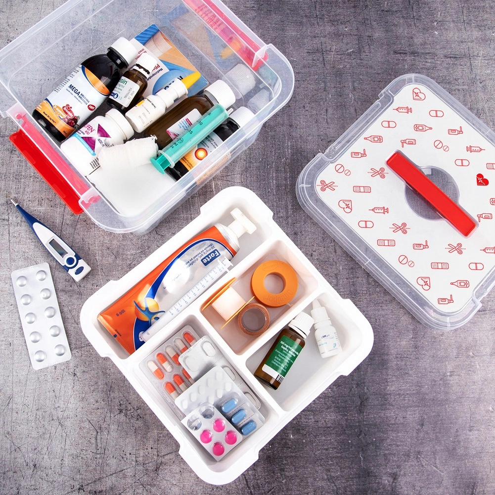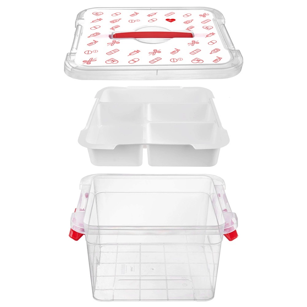 Box je vyrobený z odolného plastu s pevnými uzatváracími klipmi a ergonomickým uchom pre bezpečné prenášanie. Veko s červenými ikonami (tablety, teplomery, striekačky, fľaštičky, náplasti) jasne naznačuje určenie – domáca lekárnička. Hodí sa do domácností, zdravotníckych zariadení, lekární aj domovov pre seniorov.