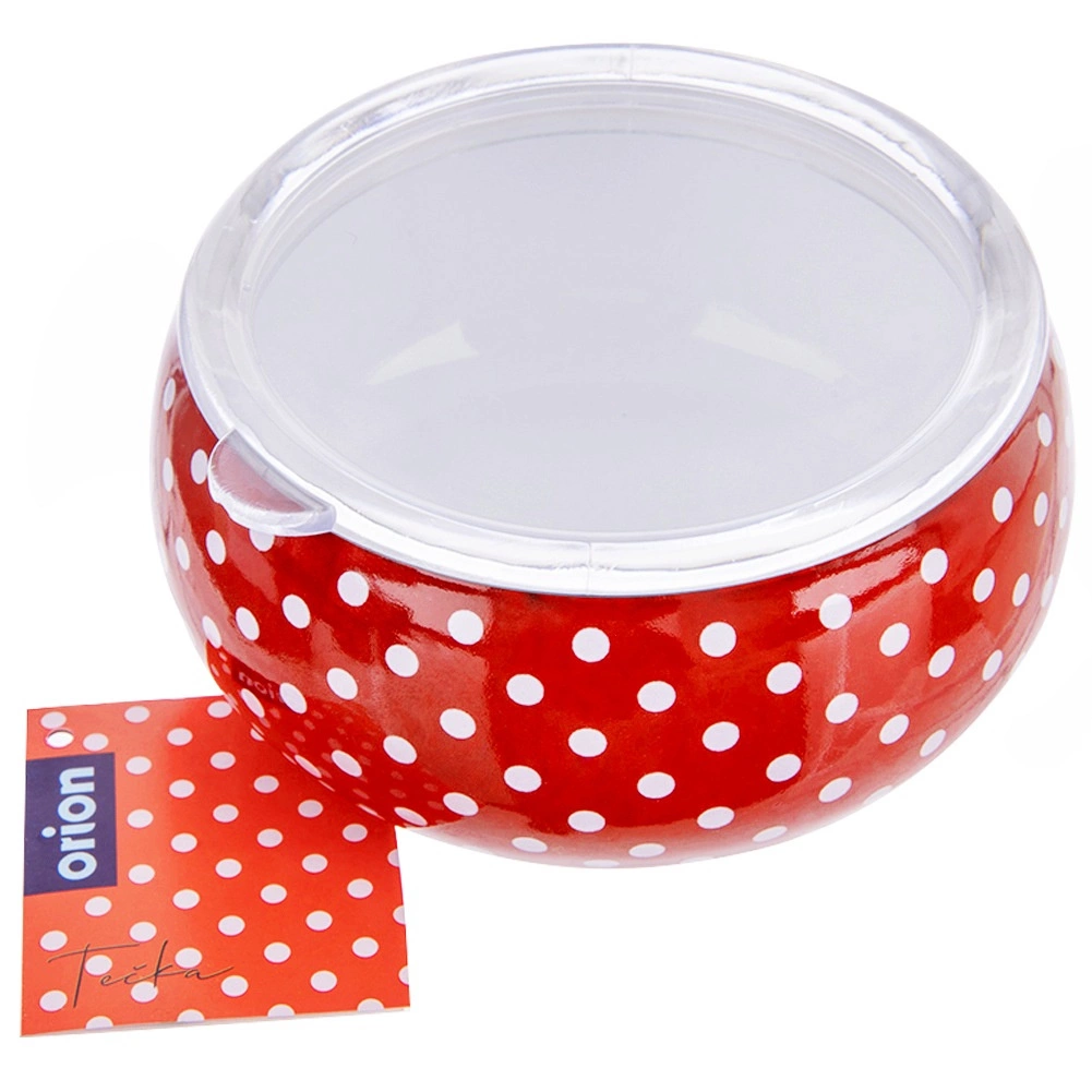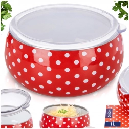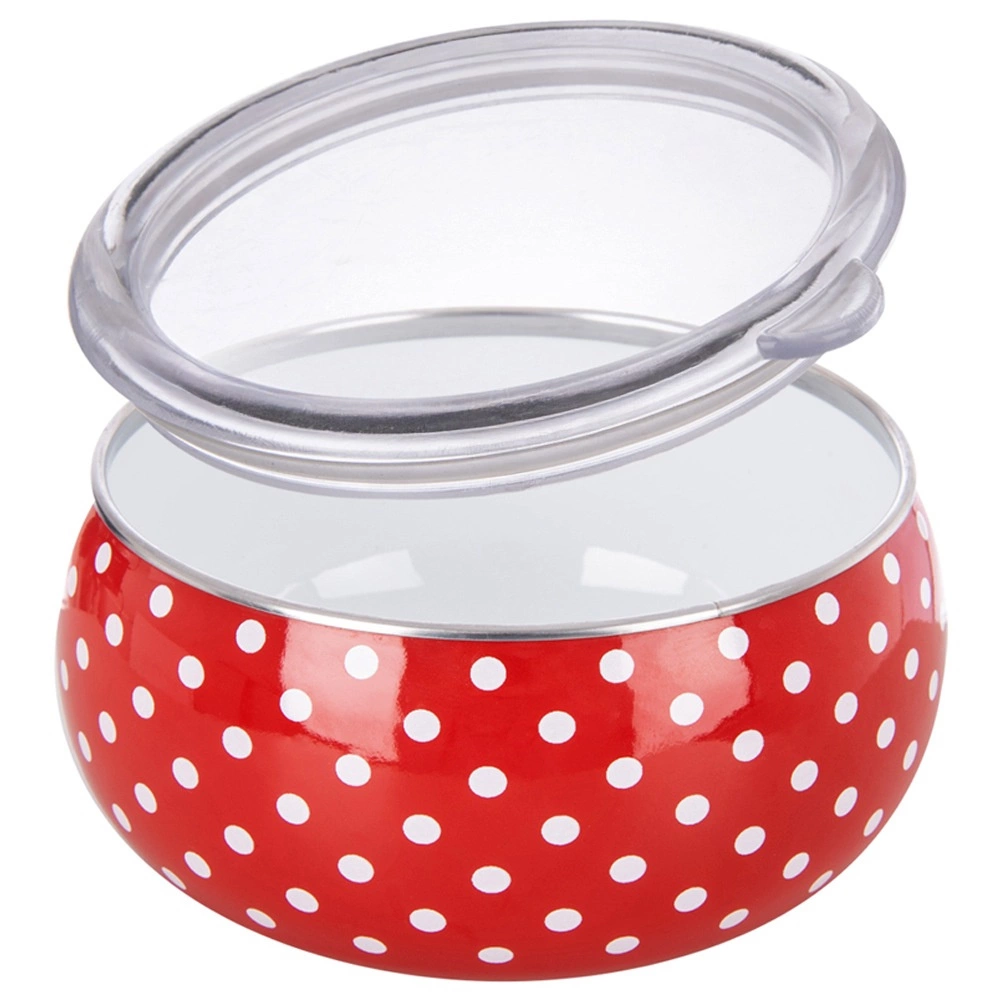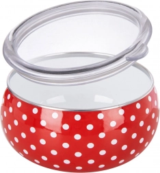 Guľatá miska z kolekcie Bodka zaujme retro dizajnom s bodkami a praktickým priehľadným vekom, vďaka ktorému ihneď vidíte obsah. Smalt je zdravotne nezávadný a vhodný aj pre alergikov. Miska má rozmery 15,5 × 15,5 × 7,5 cm a objem 1 l – perfektná na šaláty, prílohy, polievky, ovocie či desiaty.