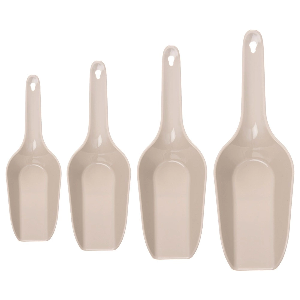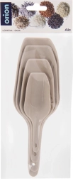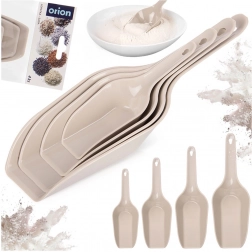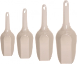 Praktická sada štyroch naberačiek v rôznych veľkostiach na jednoduché naberanie a presýpanie sypkých potravín doma aj v gastronómii. Odolné plastové prevedenie v béžovej farbe, pohodlné rukoväte s otvorom na zavesenie a možnosť umývania v umývačke. Všestranné použitie na múku, cukor, kávu, vločky, krupicu, ľad či krmivo pre domácich miláčikov. Hladký povrch na jednoduché čistenie a úsporné stohovateľné uloženie.