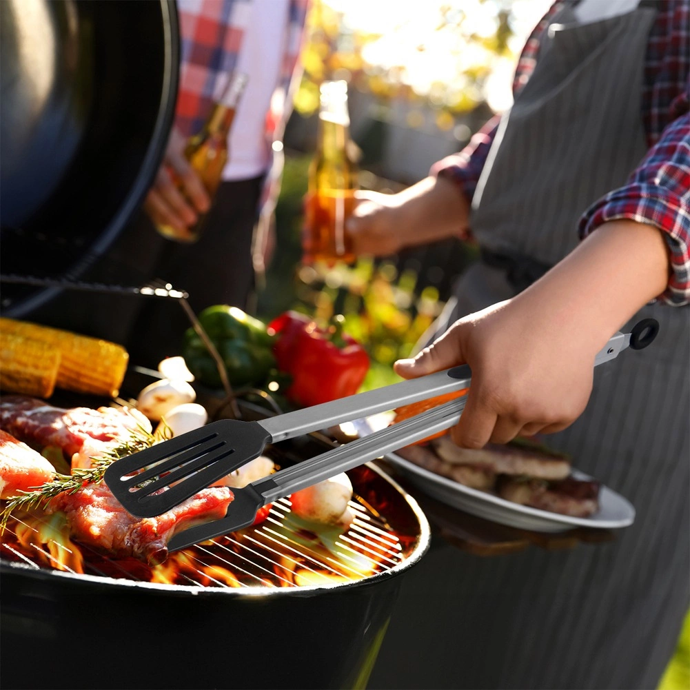 Tieto dlhé grilovacie kliešte uľahčia manipuláciu s jedlom na grile aj na panvici. Kombinácia nehrdzavejúcej ocele a tepelne odolných nylonových koncoviek (do 200 °C) zabezpečuje pevný úchop a zároveň ochranu nepriľnavých povrchov. Vďaka dĺžke 44 cm udržia vaše ruky v bezpečnej vzdialenosti od žiari.