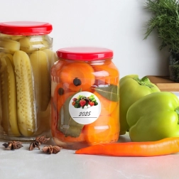Praktická sada 36 samolepiacich etikiet na poháre a fľaše s priemerom 3,5 cm. Etikety z laminovaného papiera s motívom zeleniny sa ľahko lepia bez ďalšieho lepidla a majú miesto pre názov, dátum či zloženie. Skvelé na poriadok v špajzi a elegantné označenie domácich produktov.