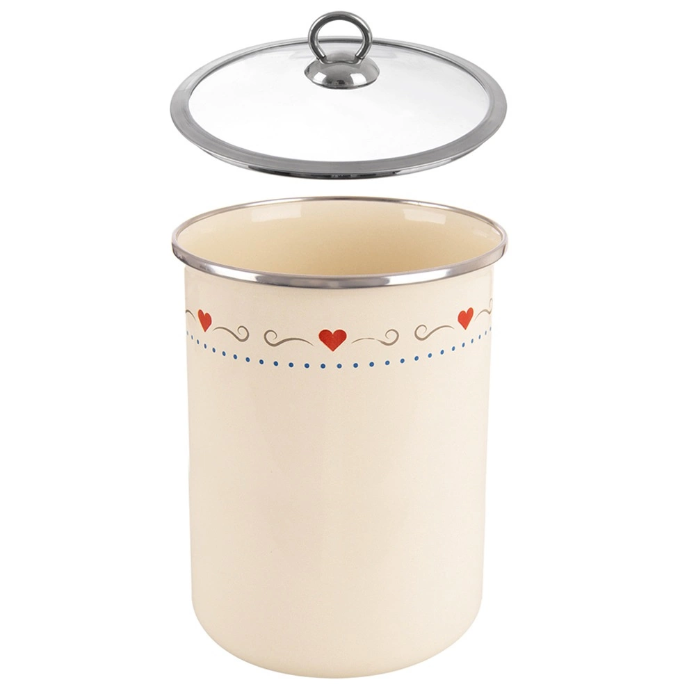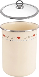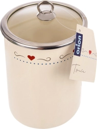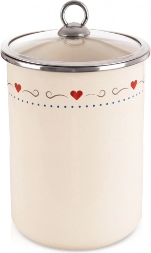Štýlová kuchynská dóza s objemom 1,9 l zo smaltovanej ocele v krémovej farbe s jemným motívom srdiečok. Má priehľadné sklenené veko s nerezovým lemom pre lepší prehľad o obsahu a ochranu pred vlhkosťou, pachmi a nečistotami. Ideálna na múku, cukor, kávu, čaj či ryžu, jednoduchá údržba a dlhá životnosť.