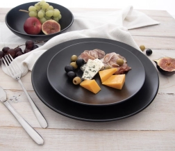 Štýlový keramický tanier v matnej čiernej farbe skvele doplní modernú aj klasickú tabuľu. Vďaka kompaktným rozmerom 20,5 × 20,5 × 2,5 cm je ideálny na dezerty, tortičky, syry, olivy či malé občerstvenie. Odolný materiál zaistí dlhú životnosť a jednoduchú údržbu.