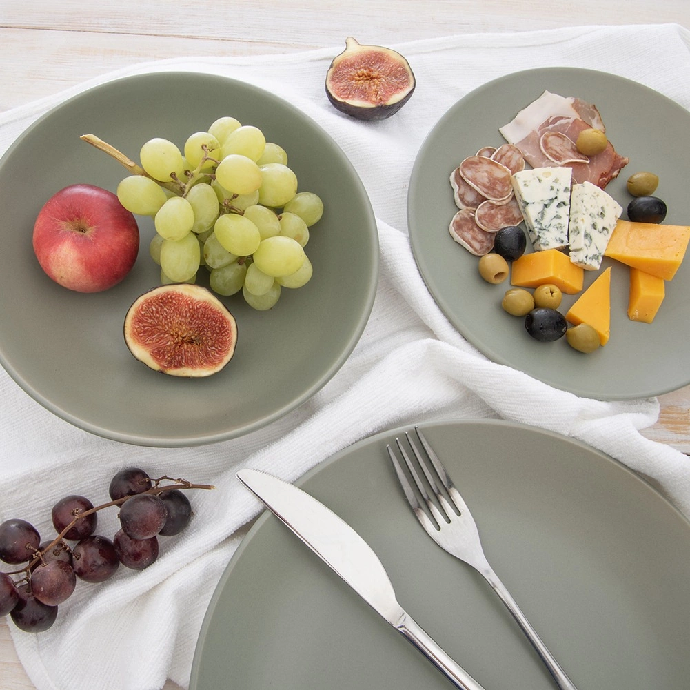 Matná olivovozelená povrchová úprava pôsobí elegantne a ľahko sa kombinuje s ďalšími farbami a textúrami pri stolovaní.