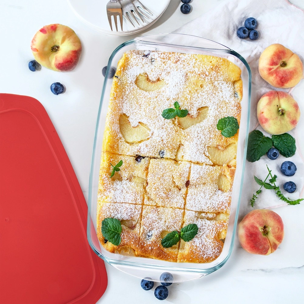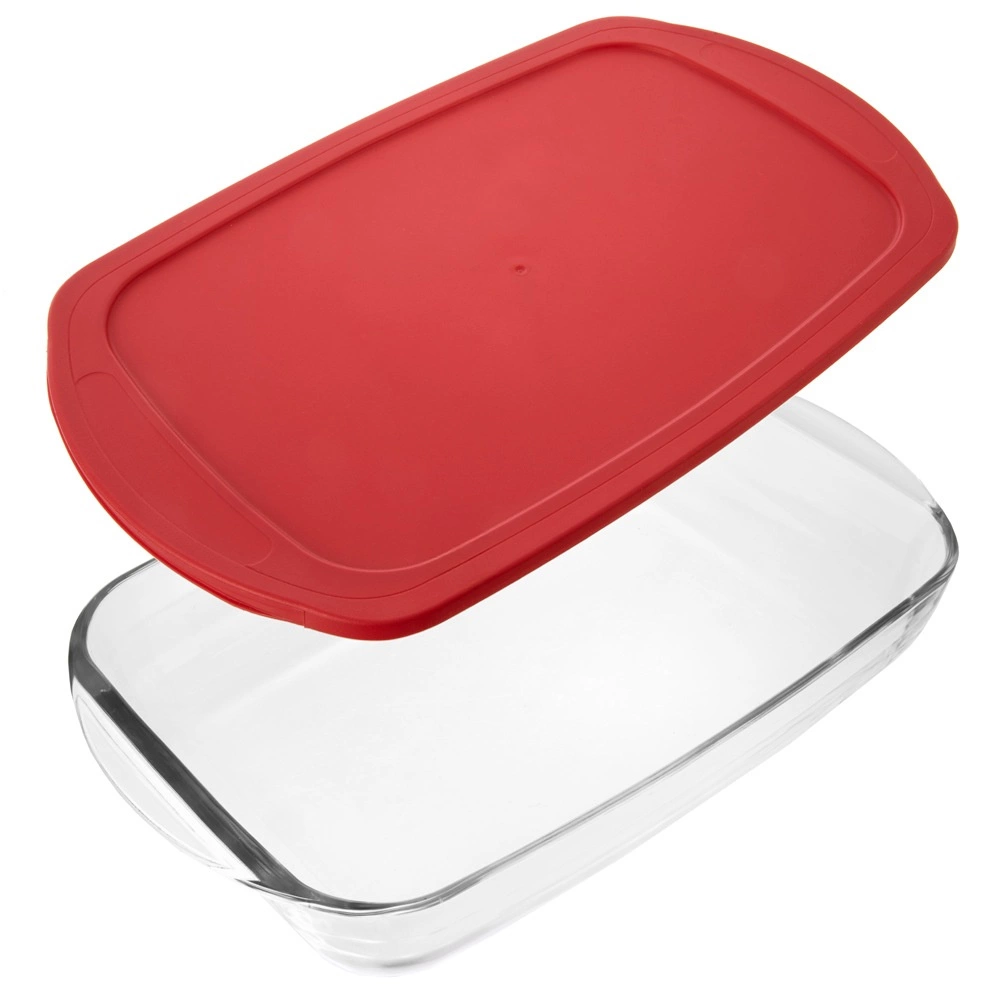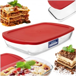 Praktická sklenená zapekacia misa s červeným vekom s objemom 3,7 l je ideálna na pečenie, zapekanie aj servírovanie. Vyrobená z borosilikátového skla odolného voči teplotám od -20 °C do +300 °C, s pohodlnými úchytmi a vzduchotesným vekom pre čerstvosť a bezpečný prenos. Vhodná do rúry, chladničky, mrazničky aj umývačky; v mikrovlnke používajte len bez veka.