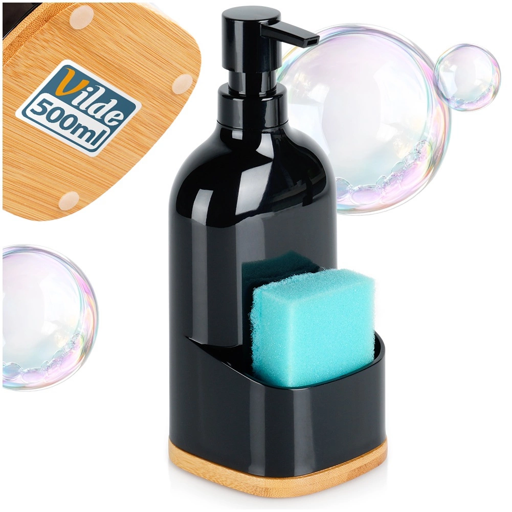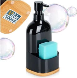 Praktický dávkovač na umývanie riadu s predným úložným priestorom na hubku alebo handričku vám pomôže mať všetko poruke. Kvalitný plast v matnej čiernej farbe a bambusová základňa dodajú vašej kuchyni prírodný akcent a moderný vzhľad. Vďaka objemu 500 ml nemusíte dopĺňať príliš často.