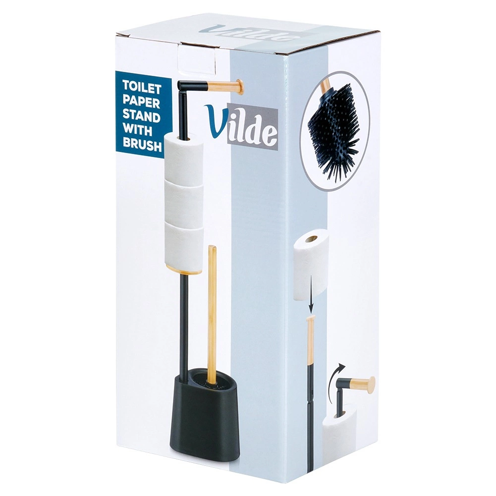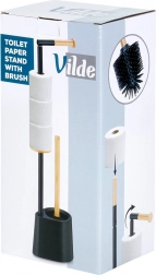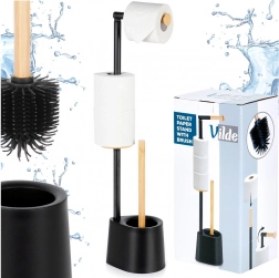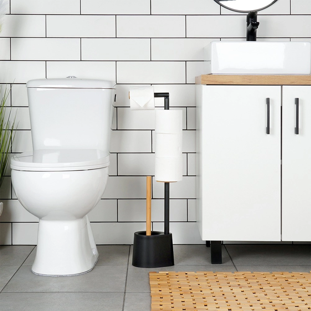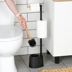 Udržujte kúpeľňu prehľadnú vďaka premyslenému stojanu, ktorý podáva a zároveň skladuje toaletný papier a obsahuje WC štetku so silikónovými štetinami pre hygienické čistenie. Minimalistický dizajn v čiernej farbe s prírodným akcentom bambusu pôsobí vkusne a nadčasovo.