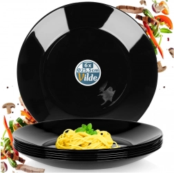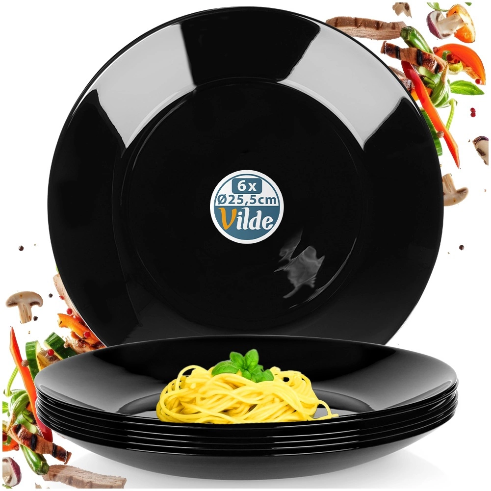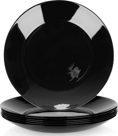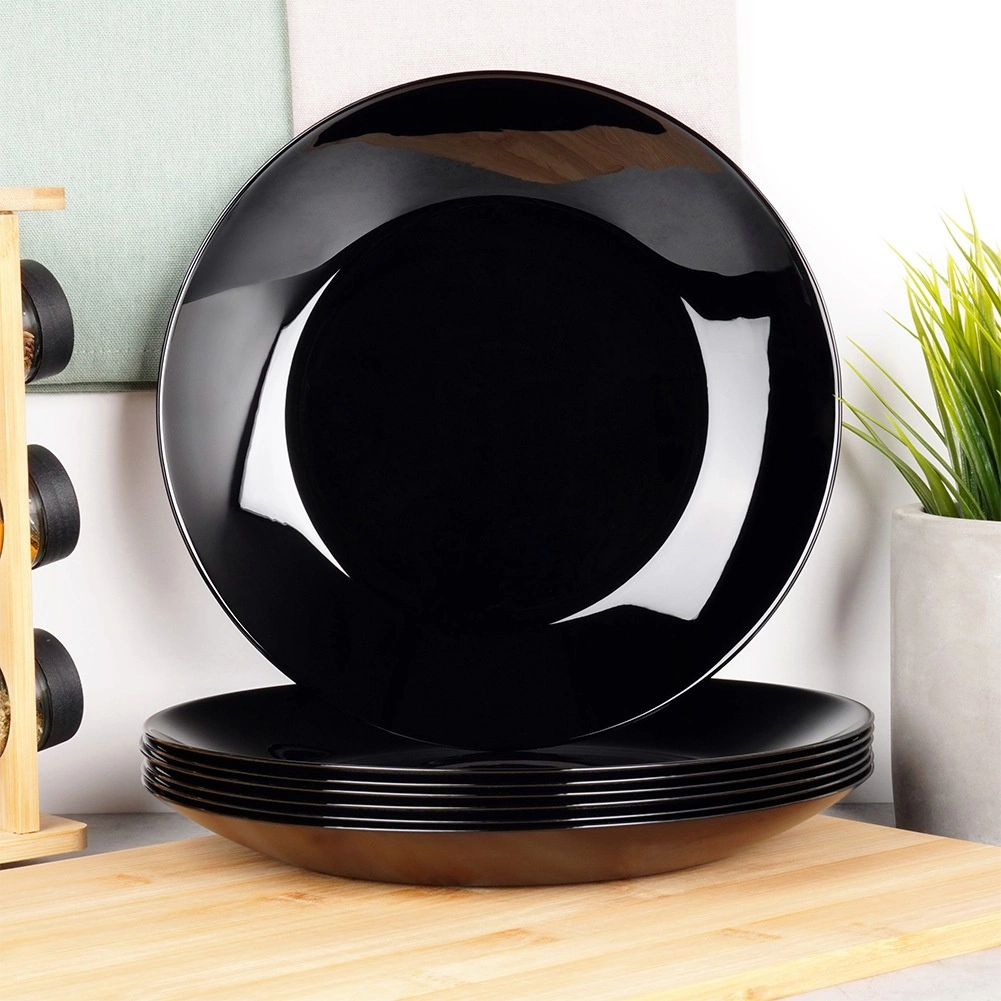 Sada 6 univerzálnych plytkých tanierov z kvalitného opálového skla s elegantným čiernym leskom. Vďaka nadčasovému vzhľadu a odolnému spracovaniu skvele doplní vašu stolovú výbavu – od každodenného obeda až po sviatočnú hostinu. Materiál pripomína porcelán, no je praktický na údržbu a dlhodobo odolný.