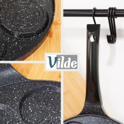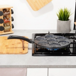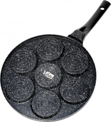 Praktická granitová panvica na vajcia a lievance so 7 kruhovými formami s priemerom 8 cm pre dokonale guľatý tvar. Odolné hliníkové telo s nepriľnavou granitovou povrchovou úpravou umožňuje variť s minimom oleja. Ergonomická rukoväť s otvorom na zavesenie, rovnomerná distribúcia tepla pre rýchle a úsporné vyprážanie. Vhodná na plynové, elektrické aj sklokeramické sporáky a do umývačky.