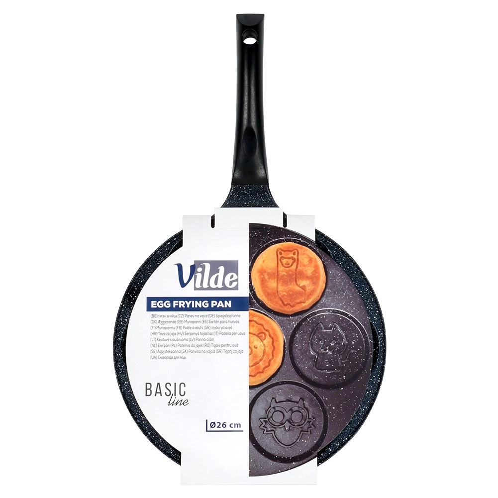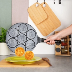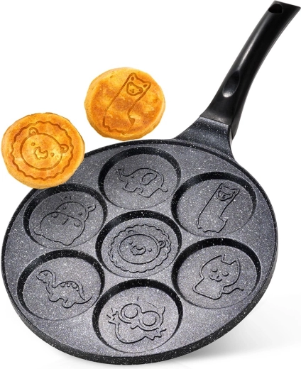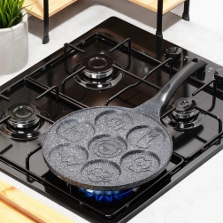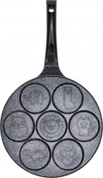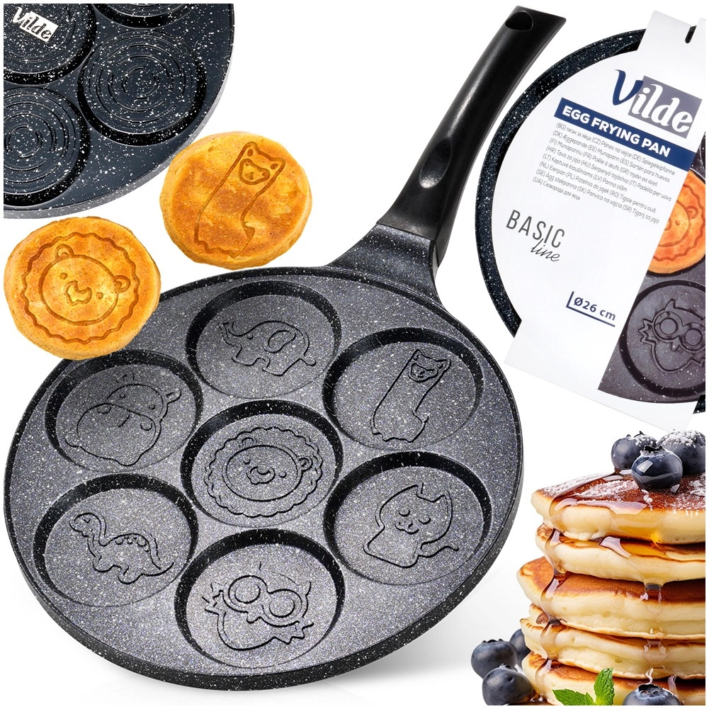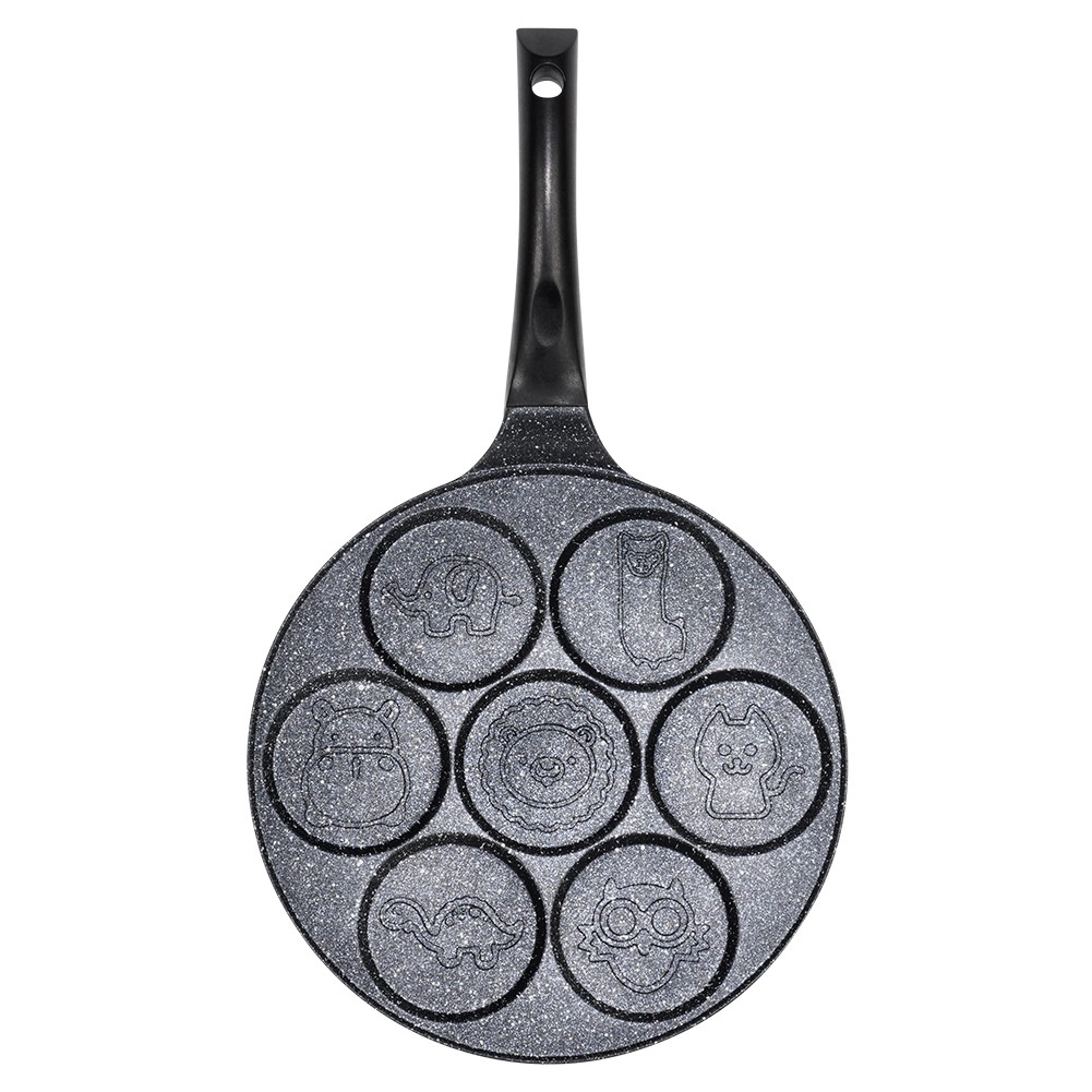 Táto štýlová panvica so siedmimi formami je ideálna na prípravu vajec, lievancov a mini pancakes s veselými reliéfmi zvieratiek. Nepriľnavý granitový povrch zaistí ľahké uvoľnenie pokrmov a jednoduché čistenie, zatiaľ čo hliníkové telo poskytuje rýchly a rovnomerný rozvod tepla.