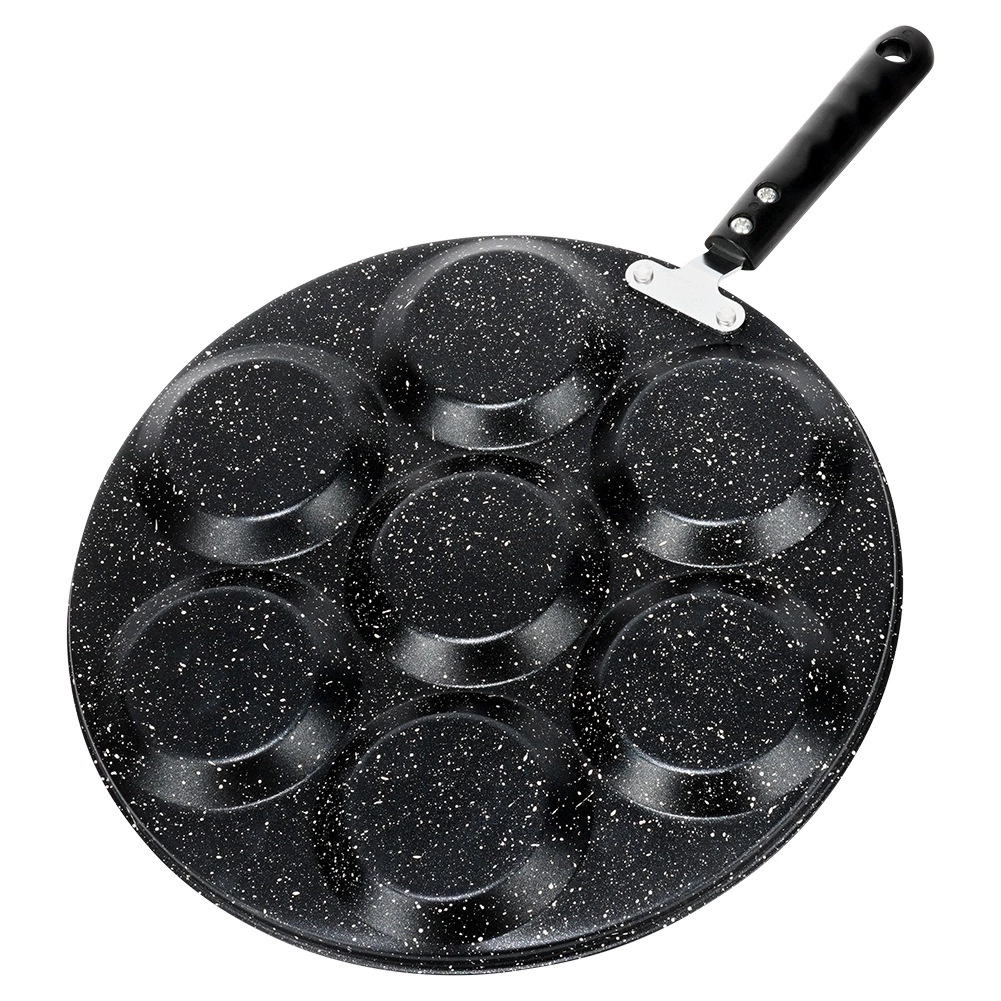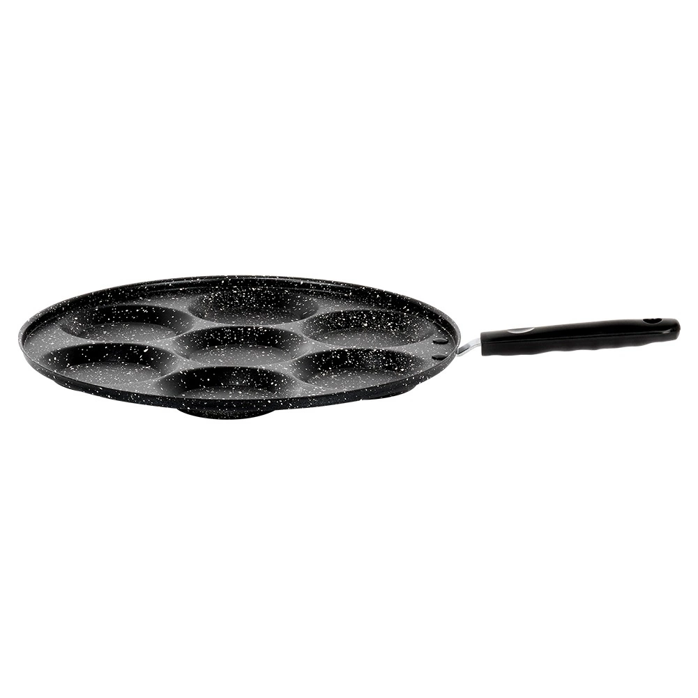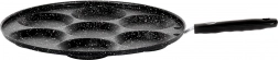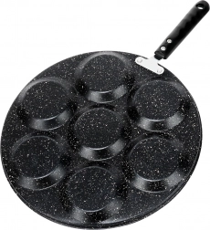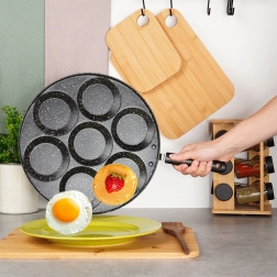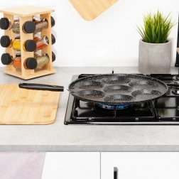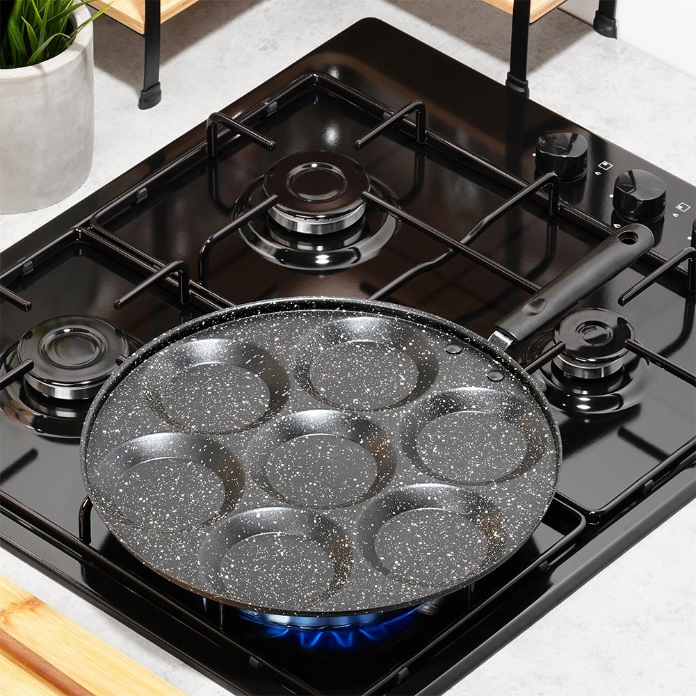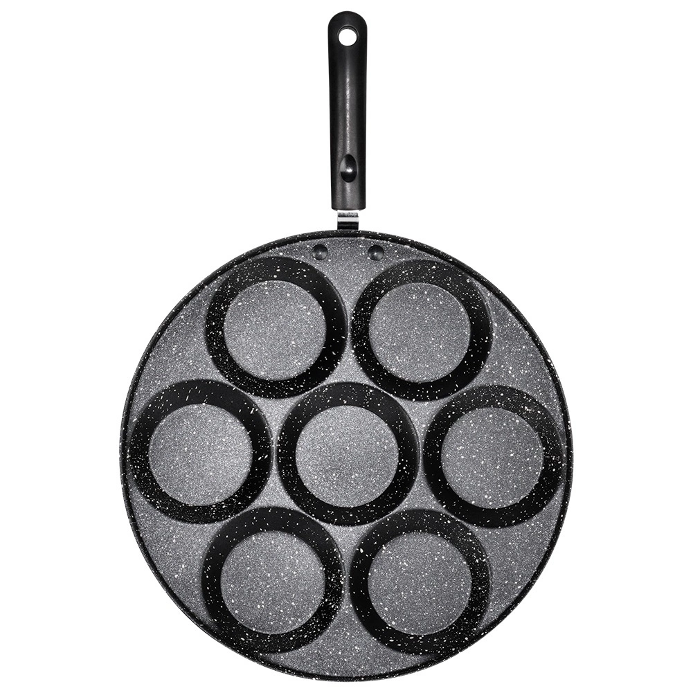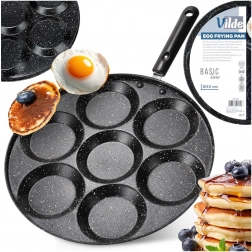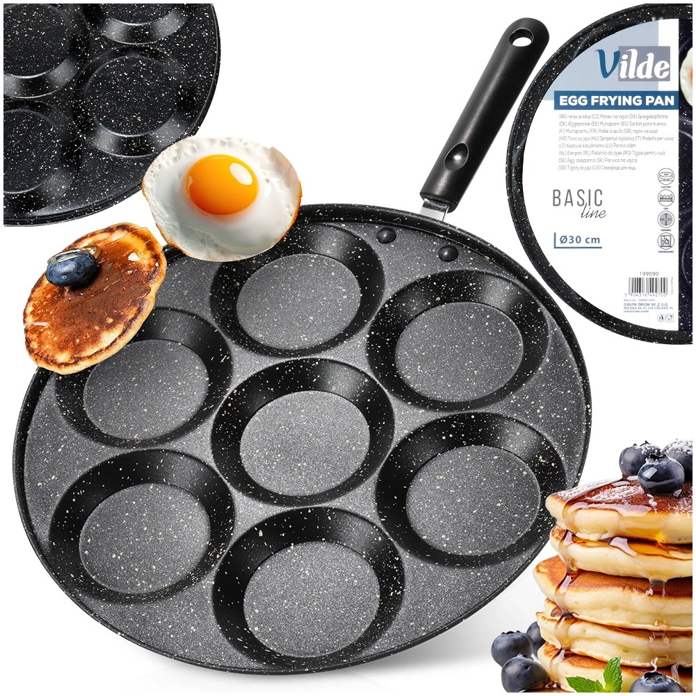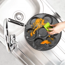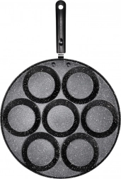 Objavte všestrannú panvicu na rýchlu a pohodlnú prípravu raňajok. Sedem samostatných foriem s priemerom 9 cm vytvára rovnomerné a jednotné porcie, ideálne na vajcia, lievance aj poffertjes. Kvalitná nepriľnavá granitová úprava minimalizuje pripaľovanie a umožňuje varenie s menším množstvom oleja.