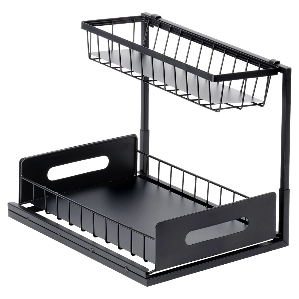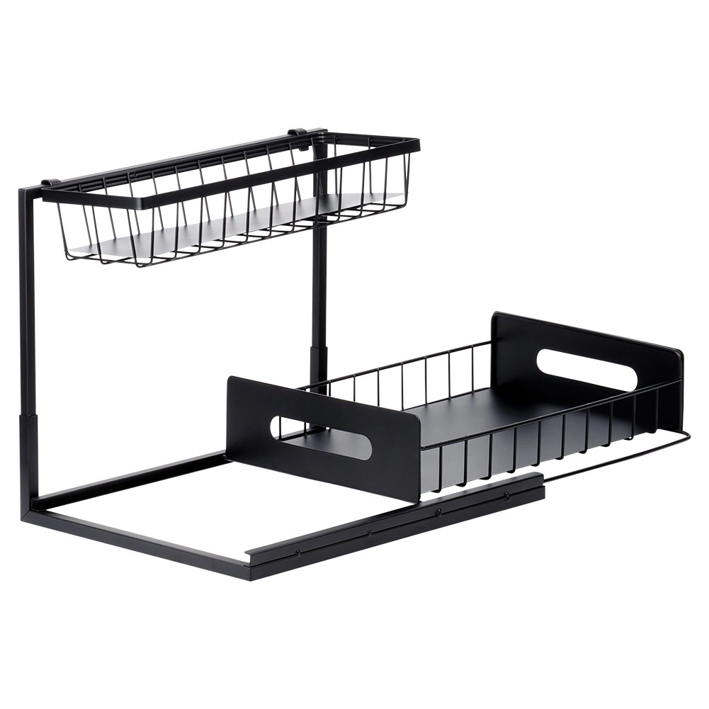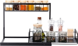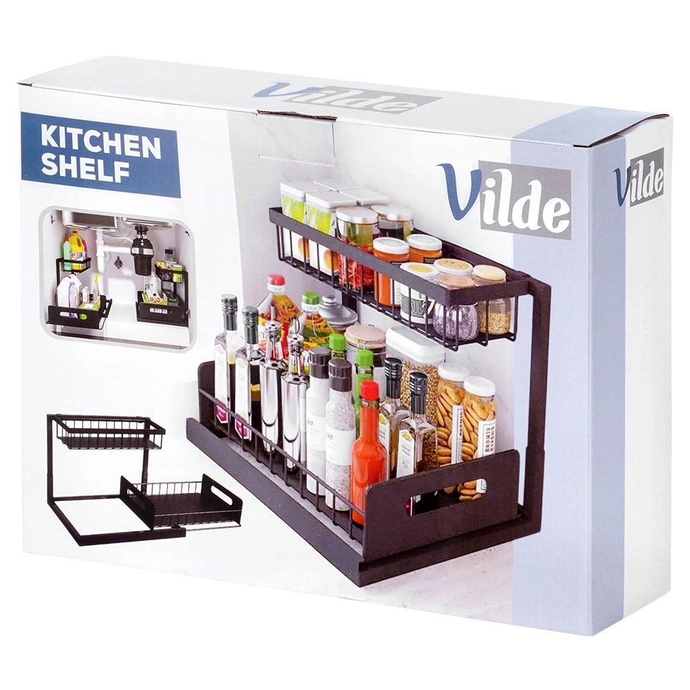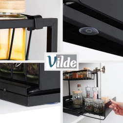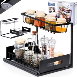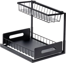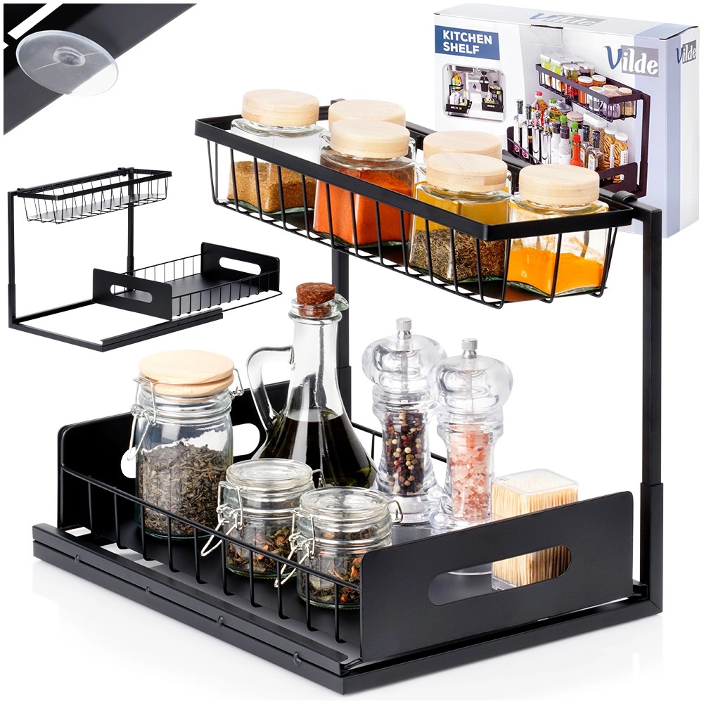 Praktická dvojúrovňová kuchynská polička s výsuvnou dolnou zásuvkou z pevného kovu v čiernej farbe udrží koreniny, poháriky a drobné kuchynské doplnky prehľadne na jednom mieste. Výsuvná spodná polícia uľahčuje prístup, stabilná konštrukcia zabezpečuje odolnosť a bočné úchyty pohodlné prenášanie. Vhodná do skriniek, pod drez aj na kuchynskú linku.
