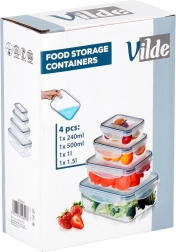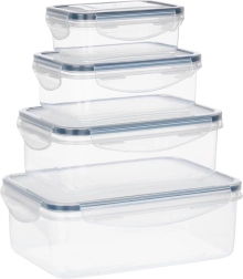 Sada obdĺžnikových dóz s objemami 1,5 l, 1 l, 500 ml a 240 ml zaistí poriadok v kuchyni aj chladničke. Priehľadné steny umožňujú rýchlu kontrolu obsahu bez otvárania a kompaktný tvar šetrí miesto pri skladovaní aj stohovaní.