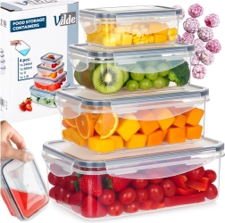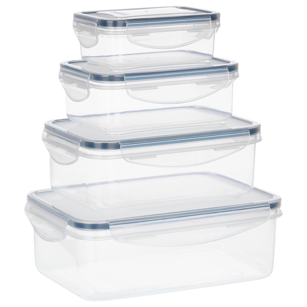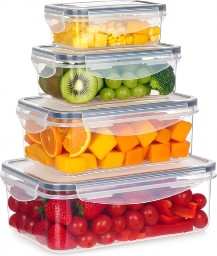 Praktická sada štyroch priehľadných dóz s vekami a silikónovým tesnením udrží vaše jedlo dlhšie čerstvé a bezpečne uložené. Rôzne veľkosti na skladovanie aj meal prep, vzduchotesné uzavretie vďaka štyrom klipom, bez BPA a vhodné do umývačky, mikrovlnky (bez veka) aj mrazničky.
