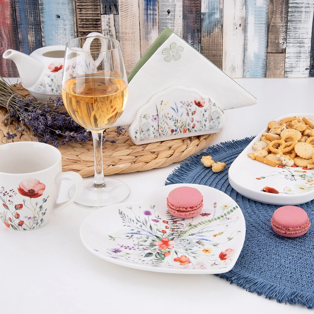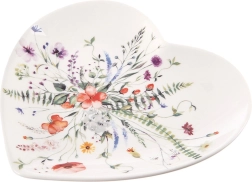 Tento porcelánový tanier v tvare srdca z kolekcie Maki dodá vášmu stolu romantický nádych. Biela glazúra s farebným dekorom lúčnych kvetov pôsobí sviežo a elegantne, vďaka čomu je tanier vhodný na každodenné použitie aj slávnostné stolovanie.