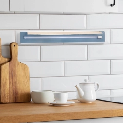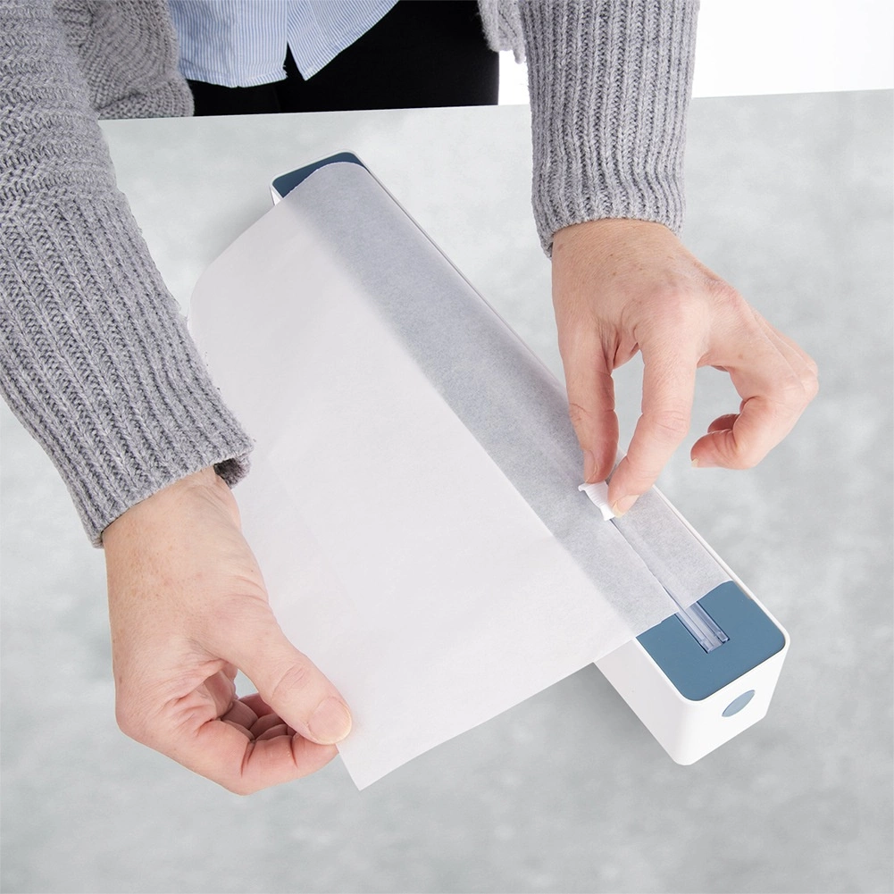 Udržte kuchyňu v dokonalom poriadku s elegantným dávkovačom, ktorý kombinuje rýchle odmeranie, čistý strih bez strapkania a pohodlné uloženie roliek. Integrovaná lišta s ostrým britom reže plynule a rovno, zatiaľ čo zarážky vo vnútri bránia posuvu rolky.