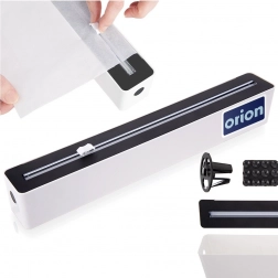 Dlhá rezacia lišta s posuvným britom umožňuje rýchle a rovné odrezanie fólie či papiera – bezpečne a bez zubatých okrajov.
