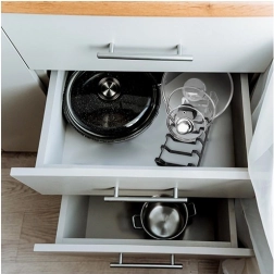 Oddelené drážky udržia pokrievky a taniere stabilne vo zvislej polohe, takže máte všetko hneď po ruke a bez zbytočného chaosu.