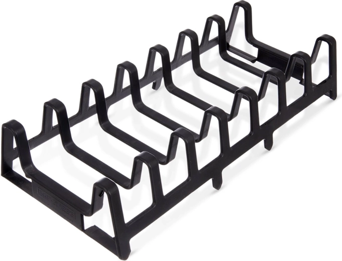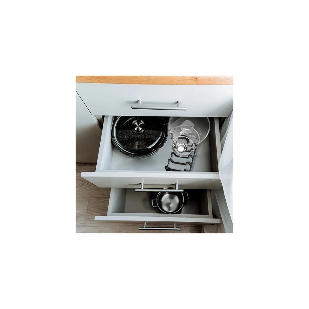 Už žiadne povaľujúce sa pokrievky a taniere. Tento univerzálny stojan 30 × 14 × 6 cm udrží všetko bezpečne na svojom mieste a prehľadne oddelené. Vďaka kompaktným rozmerom sa hodí na pracovnú dosku, do skrinky aj hlbokej zásuvky. Čierny dizajn ľahko zapadne do každej kuchyne.
