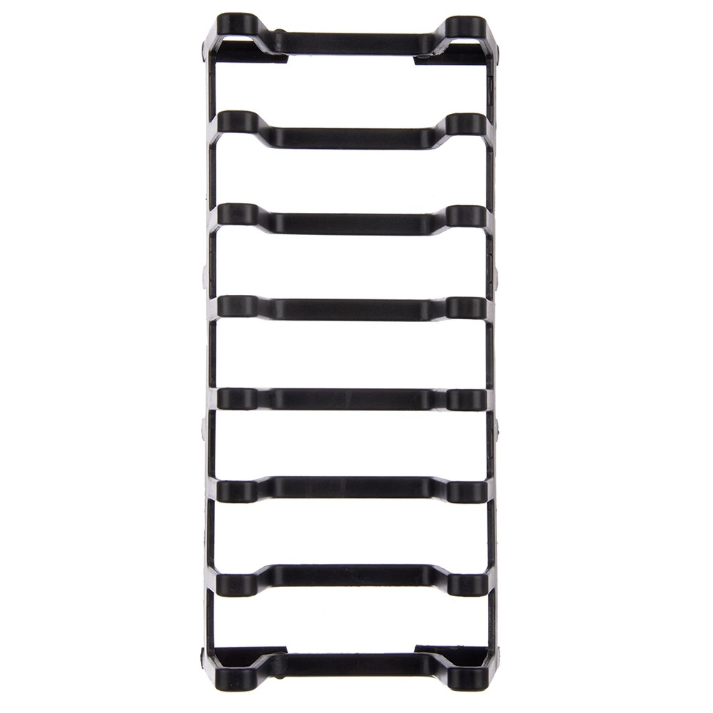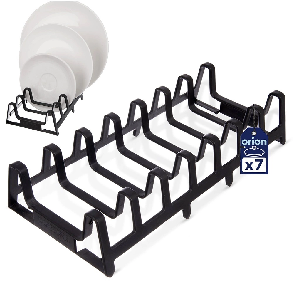 Stojan pojme až 7 kusov – hodí sa na pokrievky, plytké taniere aj krájacie dosky. Otvorená konštrukcia umožňuje jednoduché vkladanie a rýchly prístup, zatiaľ čo pevné deliace prvky držia všetko stabilne. Kvalitný plast je ľahký, ľahko sa čistí a pri správnom používaní vydrží roky.