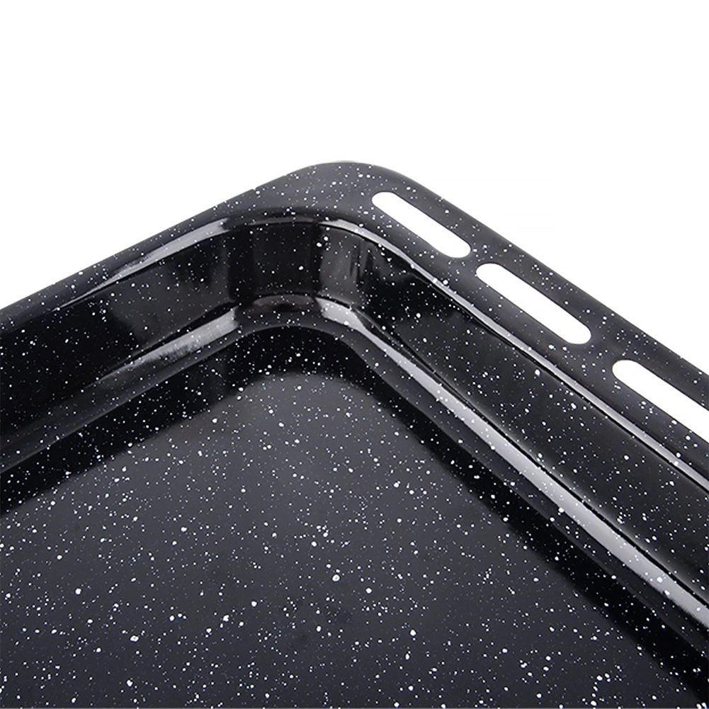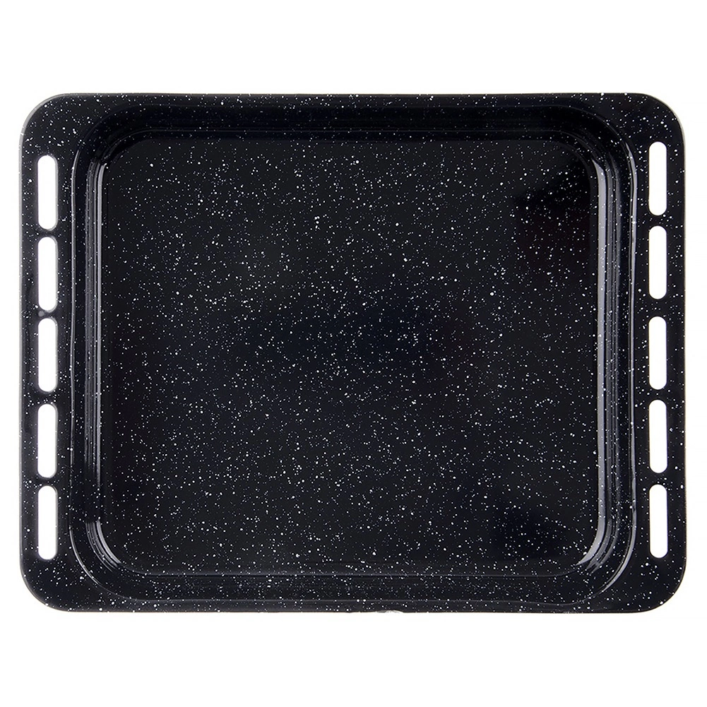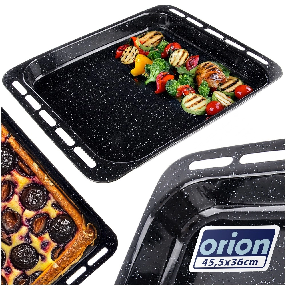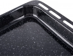 Vonkajšie rozmery plechu sú 45,5 × 36 × 5 cm, vnútorné 38 × 34 × 5 cm – získate tak dostatok priestoru pre rodinné porcie aj väčšie plechy koláčov. Hladký smalt uľahčuje údržbu a je vhodný do umývačky, zároveň je odolný voči poškriabaniu a vysokým teplotám v plynových aj elektrických rúrach.