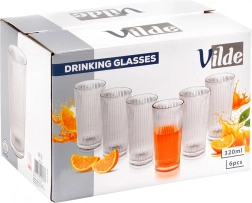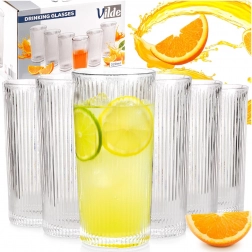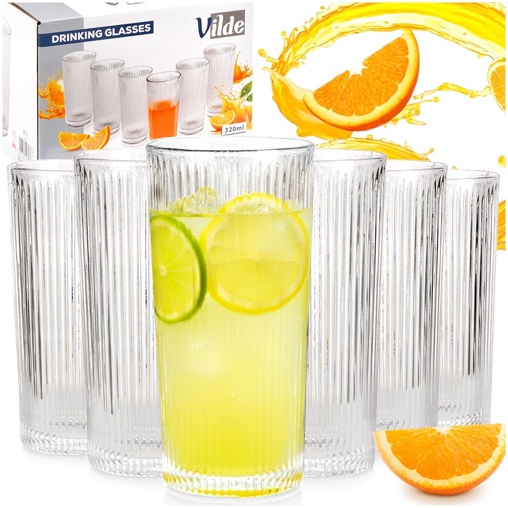 Elegantná sada šiestich vysokých pohárov s objemom 320 ml s vertikálnym ryhovaním pre lepší úchop a štýl. Ideálne na vodu, limonádu, džúsy aj koktaily, z odolného skla a vhodné do umývačky.