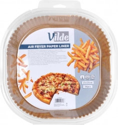 Udržujte fritézu dokonale čistú s jednorazovými vložkami Vilde. Tieto štvorcové papierové misky s rozmerom 23 × 23 cm majú skladané okraje, sú nepriľnavé, odolné voči mastnote a vode a vhodné do teplovzdušnej fritézy, rúry aj mikrovlnky. Balenie 50 ks uľahčí varenie aj upratovanie a pomôže zachytiť tuky a omrvinky.