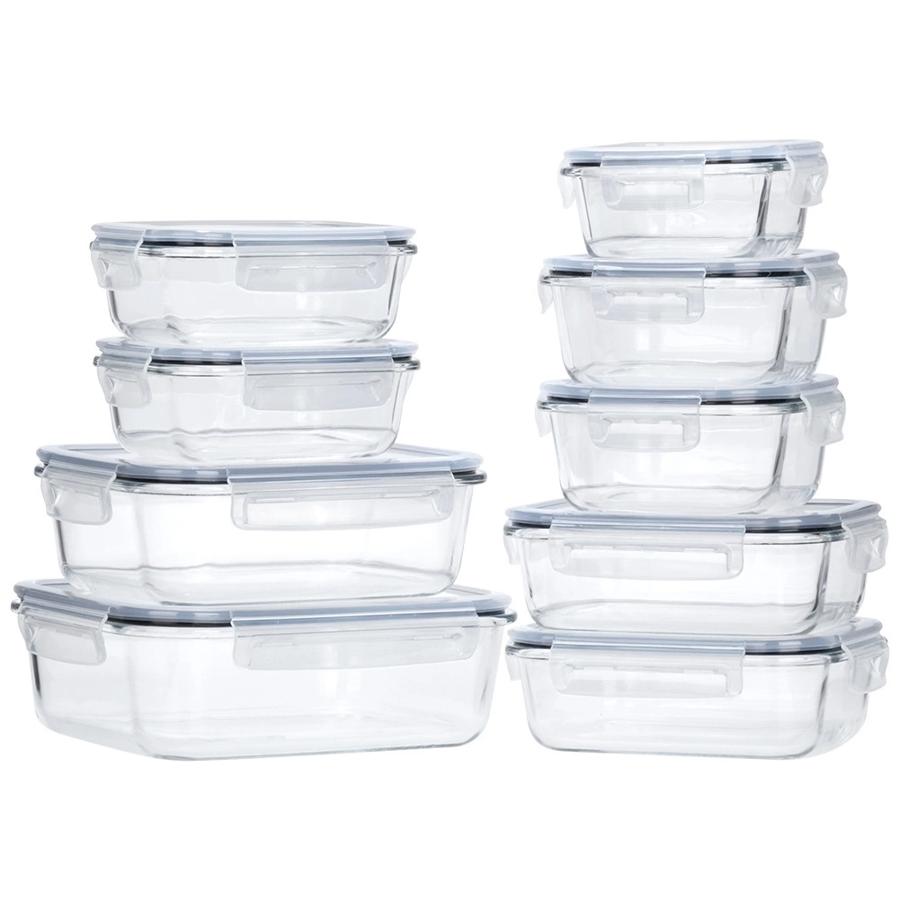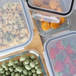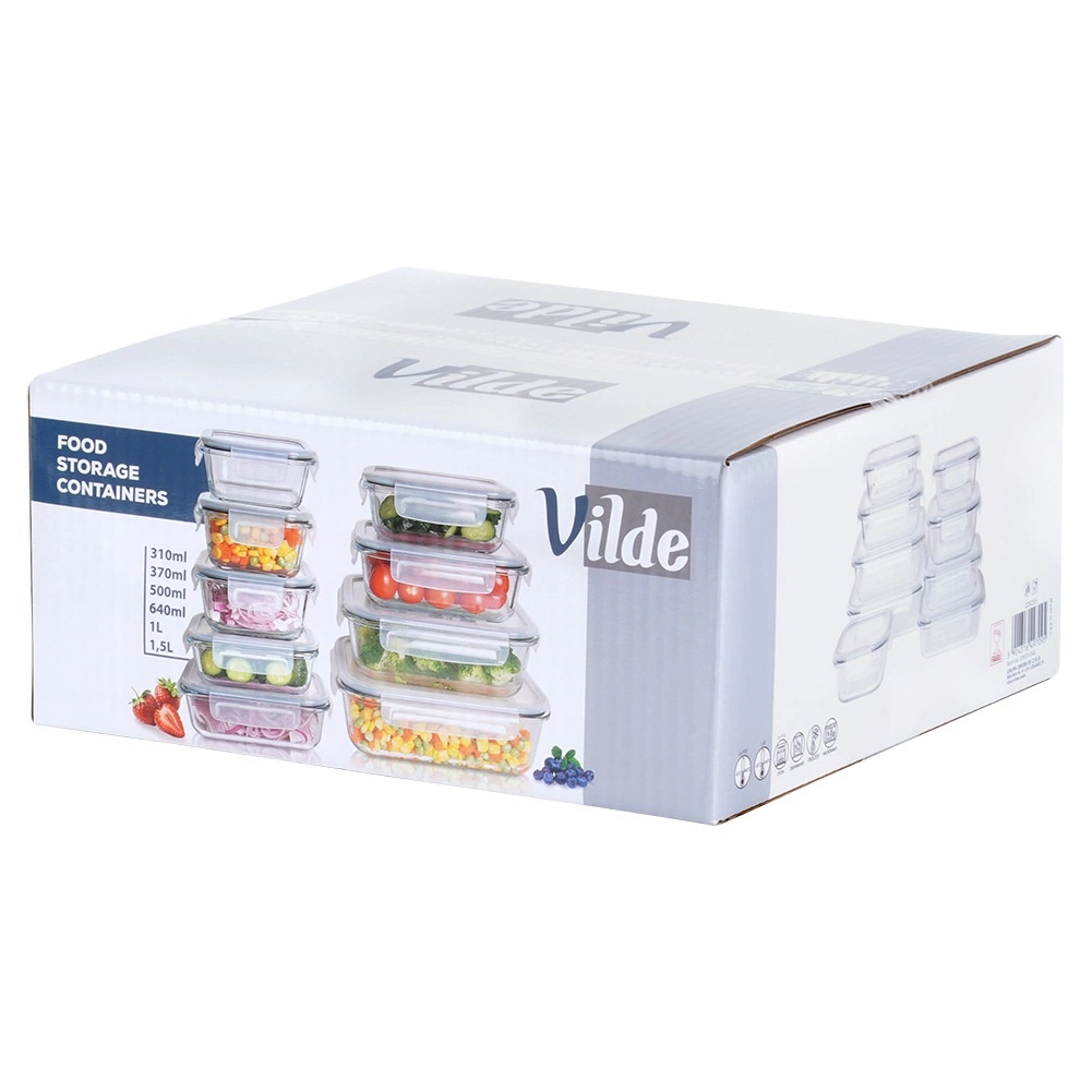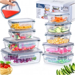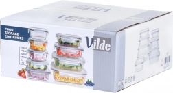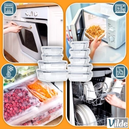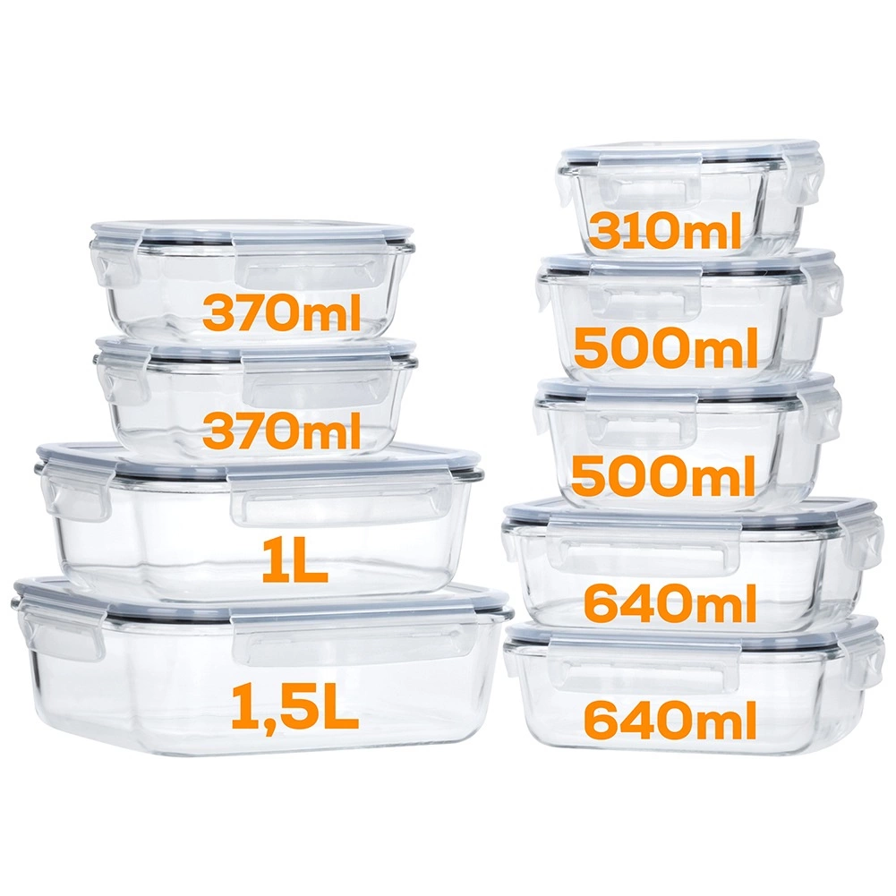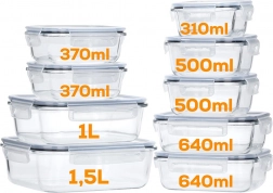 Sada obsahuje šesť obdĺžnikových a tri štvorcové dózy v rôznych veľkostiach, ktoré možno pre úsporu miesta vkladať do seba. Transparentné sklo umožní rýchlu kontrolu obsahu bez otvárania a pevné viečka so štyrmi klipmi a silikónovým tesnením zaručia tesné a hygienické uloženie.