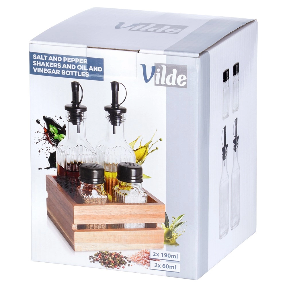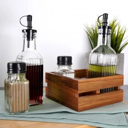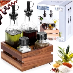 Táto štýlová sada kombinuje funkčnosť a estetiku: dve fľaše na olej a ocot s uzatvárateľnými dávkovačmi zabezpečia čisté a rovnomerné dochucovanie, soľnička a korenička ponúknu presné dávkovanie bez zbytočného rozsýpania. Všetko je uložené v pevnom stojane z akáciového dreva, takže máte dochucovadlá vždy poruke a úhľadne usporiadané na linke či jedálenskom stole.