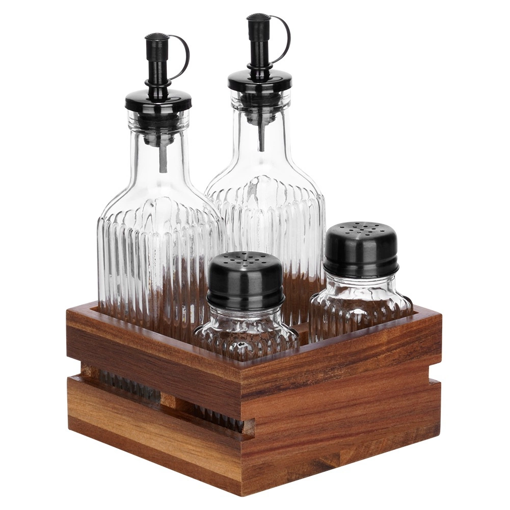 Rýhované sklo zvyšuje odolnosť a istotu úchopu, akáciový stojan udržiava všetky štyri nádoby prehľadne na jednom mieste a zabezpečuje jednoduché prenášanie.
