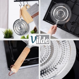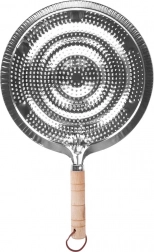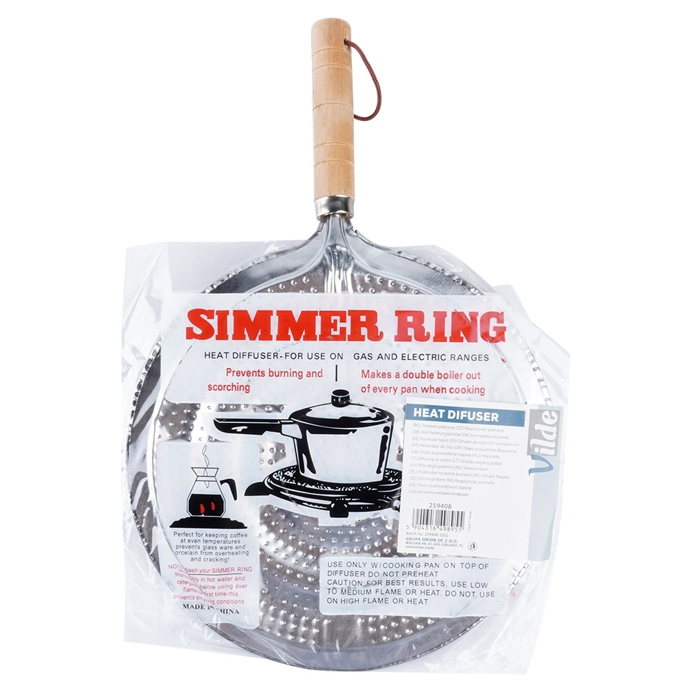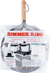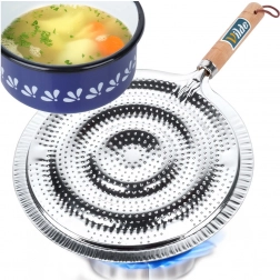 Praktický kovový rozptyľovač plameňa pre plynové sporáky s priemerom 21 cm a celkovou dĺžkou 32,5 cm. Zabezpečuje rovnomerné rozvádzanie tepla, chráni sklenené a keramické nádoby pred priamym plameňom a praskaním a má pohodlnú drevenú rukoväť s pútkom na zavesenie.