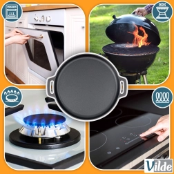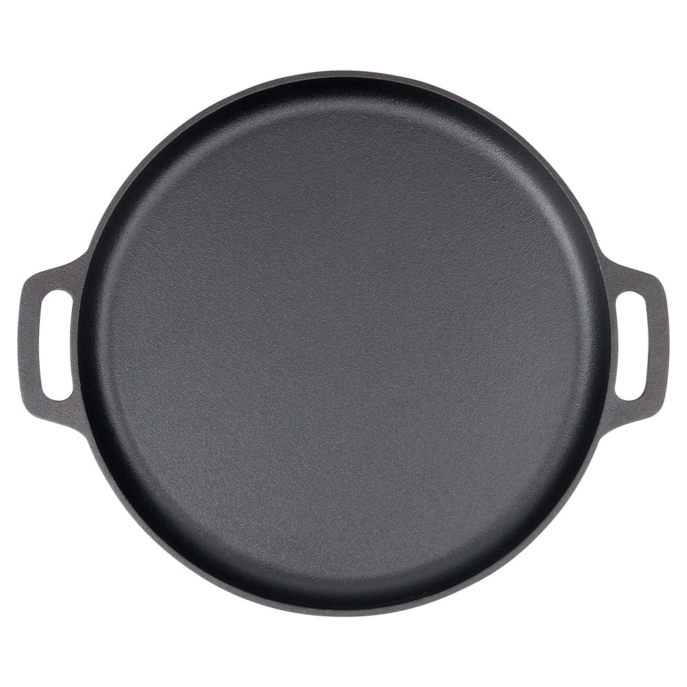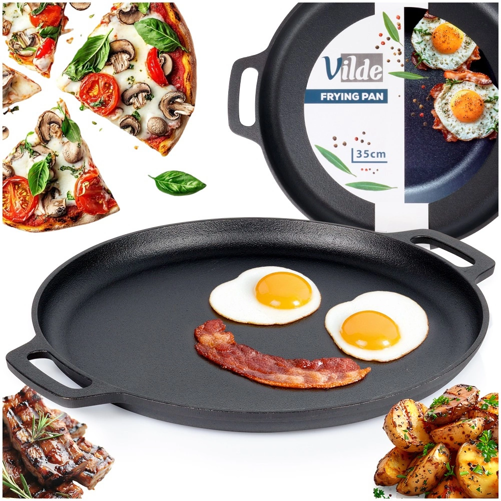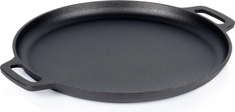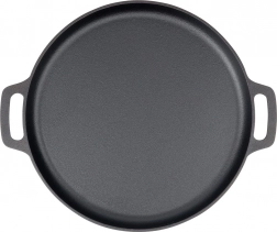Táto masívna liatinová panvica je univerzálny pomocník na každodenné varenie doma, na grile aj na otvorenom ohni. Vďaka veľkej rovnanej ploche a nízkemu okraju je skvelá na steaky, vajíčka, palacinky, tortilly, pečené zemiaky aj pizzu. Dva integrované úchyty umožňujú bezpečné prenášanie a servírovanie priamo na stôl.