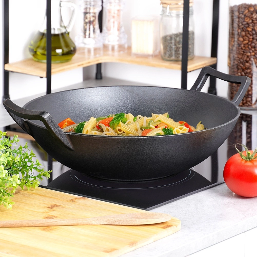 Liatina je osvedčený materiál pre wok – drží vysokú teplotu, ktorú potrebujete na rýchle restovanie, smaženie aj zapekanie. Táto wok panvica s priemerom 36 cm ponúka hlboké, priestranné telo pre veľké porcie cestovín, zeleniny, mäsa aj jedál inšpirovaných ázijskou kuchyňou. Vďaka odolnosti voči vysokým teplotám ju bez obáv použijete na sporáku, na grile aj v rúre.